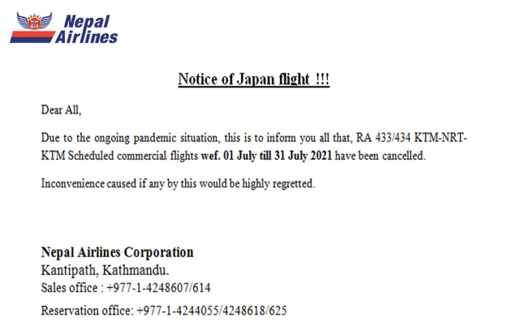 काठमाण्डु— काठमाण्डुबाट जापानको नारितामा तोकिएको नियमित उडान रद्द भएको छ । नेपाल एयरलाइन्सले एक सूचना जारी गरी नारिता उडान रद्द भएको जनाएको छ । कोरोना संक्रमणका कारण उडान रद्द गर्नु परेको कम्पनीको भनाइ छ ।