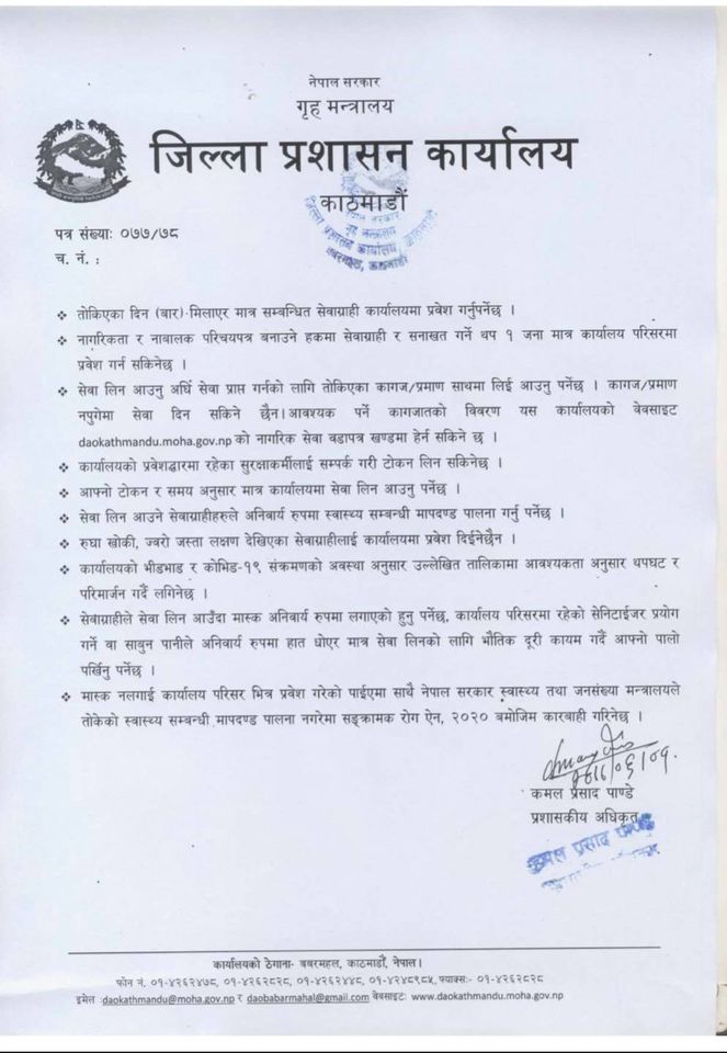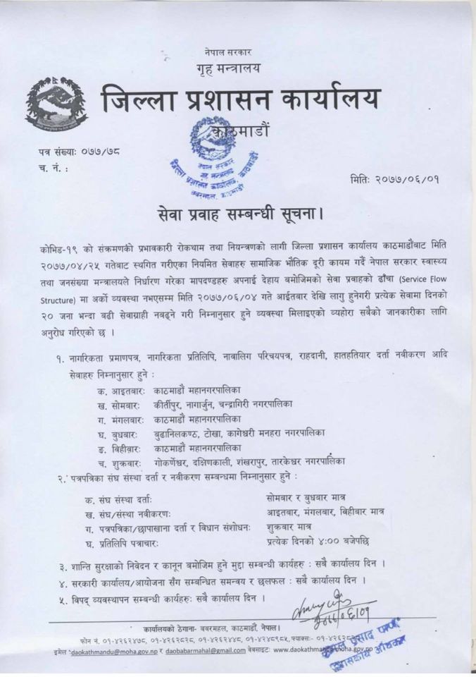 काठमाण्डु, भक्तपुर र ललितपुरका प्रमुख जिल्ला अधिकारीहरुको बैठकले यस्तो निर्णय गरेको हो । आइतबारबाट लागू हुने उक्त सूचनामा भनिएको छ, ‘साउन २५ गतेबाट स्थगित गरिएका नियमित सेवाहरु सामाजिक भौतिक दूरी कायम गर्दै नेपाल सरकार स्वास्थ्य तथा जनसंख्या मन्त्रालयले निर्धारण गरेको मापदण्डहरु अपनाई देहाय बमोजिमको ढाँचामा अर्को व्यवस्था नभएसम्म असोज ४ गतेदेखि लागू हुने गरी प्रत्येक सेवामा दिनको २० जनाभन्दा बढी सेवाग्राही नबढ्ने गरी व्यवस्था मिलाइएको छ ।’