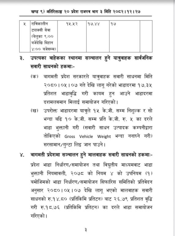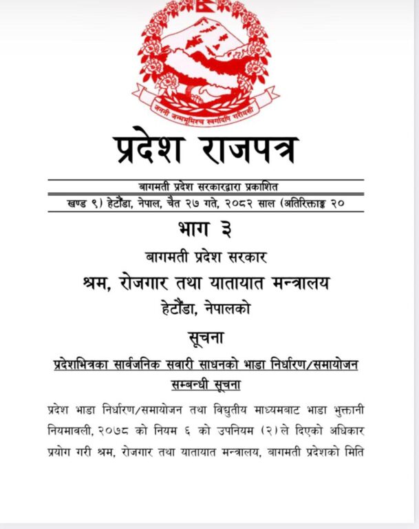 भाडा दर समायोजन गर्र्दै प्रदेश सरकारले सार्वजनिक सवारी साधनको भाडादरमा वृद्धि गरेको छ । यो नयाँ व्यवस्था काठमाण्डुउपत्यकाभित्र सञ्चालन हुने सवारी साधनका साथै उपत्यकाबाट बागमती प्रदेशका विभिन्न स्थानमा चल्ने रुटहरूमा लागू हुनेछ। दूरीका आधारमा भाडा निर्धारण गरिएको प्रदेश सरकारले जनाएको छ ।
