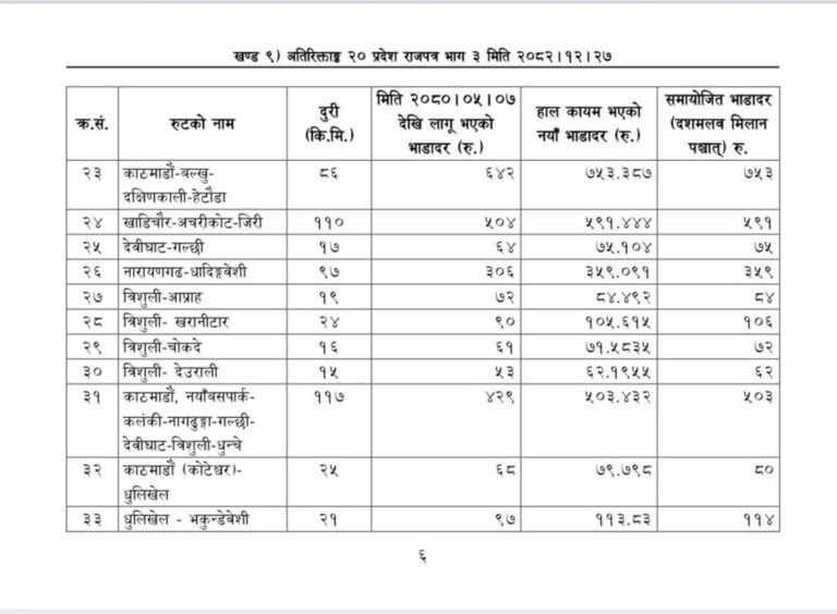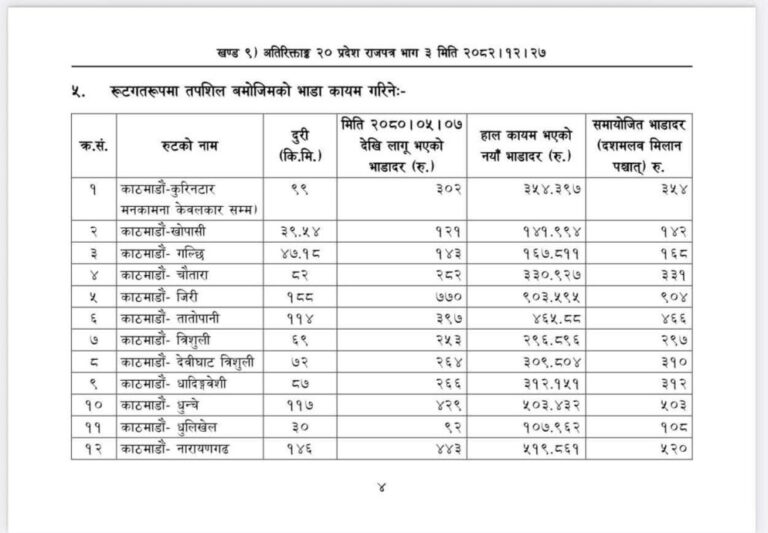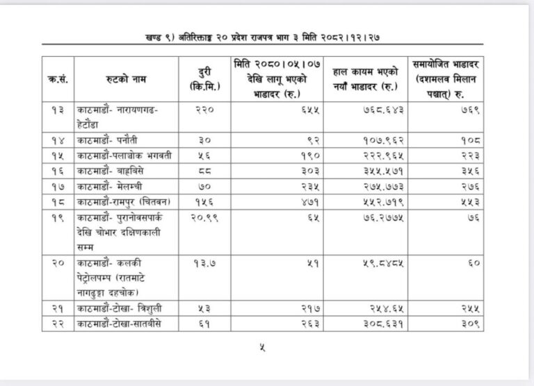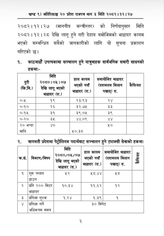 जसअनुसार ५ किलोमिटर २४ रुपैयाँ भाडा तोकिएको छ भने १० किलोमिटरको भाडा ३३ रुपैयाँ कायम गरिएको छ ।