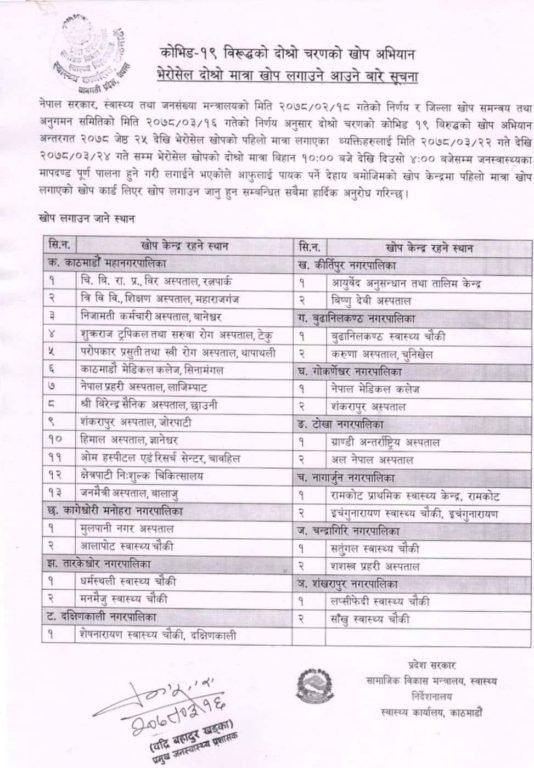 बागमती प्रदेशको सामाजिक विकास मन्त्रालय अन्तर्गत स्वास्थ्य निर्देशनालयले सूचना जारी गर्दै गत जेठ २५ देखि भेरोसेल खोपको पहिलो मात्रा लगाएकाहरूलाई आजदेखि बिहीबारसम्म दोस्रो मात्रा खोप लगाइने जानकारी दिएको हो ।