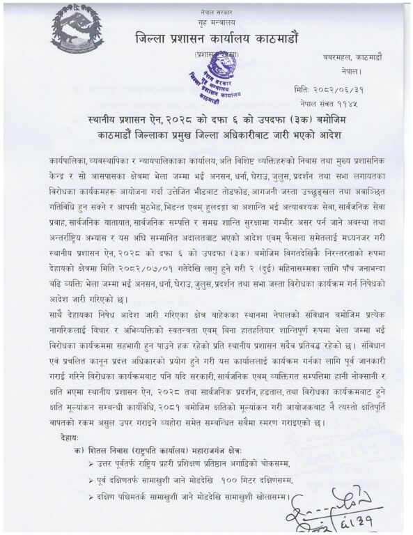 जिल्ला प्रशासन कार्यालय काठमाण्डुले भोली (शनिबार)देखि थप २ महिनासम्म लागु हुनेगरि विभिन्न ५ ठाउँमा ५ जनाभन्दा बढी भेला भई विरोधका कार्यक्रम गर्न बन्देज गरेको हो ।