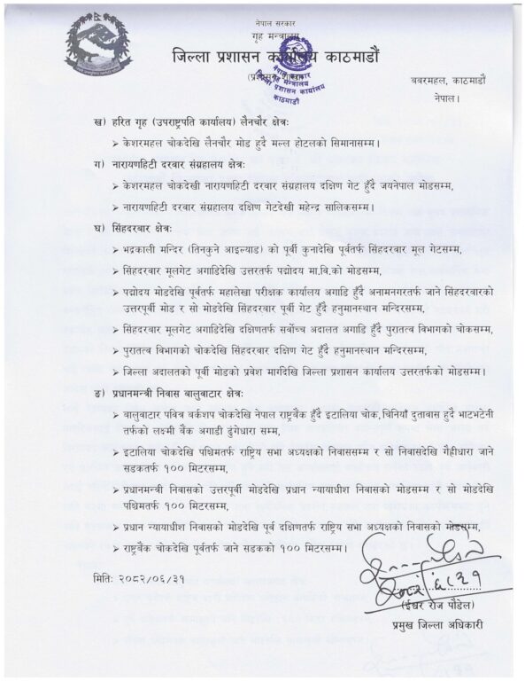 विरोध प्रदर्शनका लागि निषेध गरिएका ठाउँहरूमा शीतल निवास, उपराष्ट्रपति कार्यालय, प्रधानमन्त्री निवास बालुवाटार, सिंहदरबार, नारायणहिटी दरबार संग्रहालय तथा आसपासका क्षेत्र छन् ।