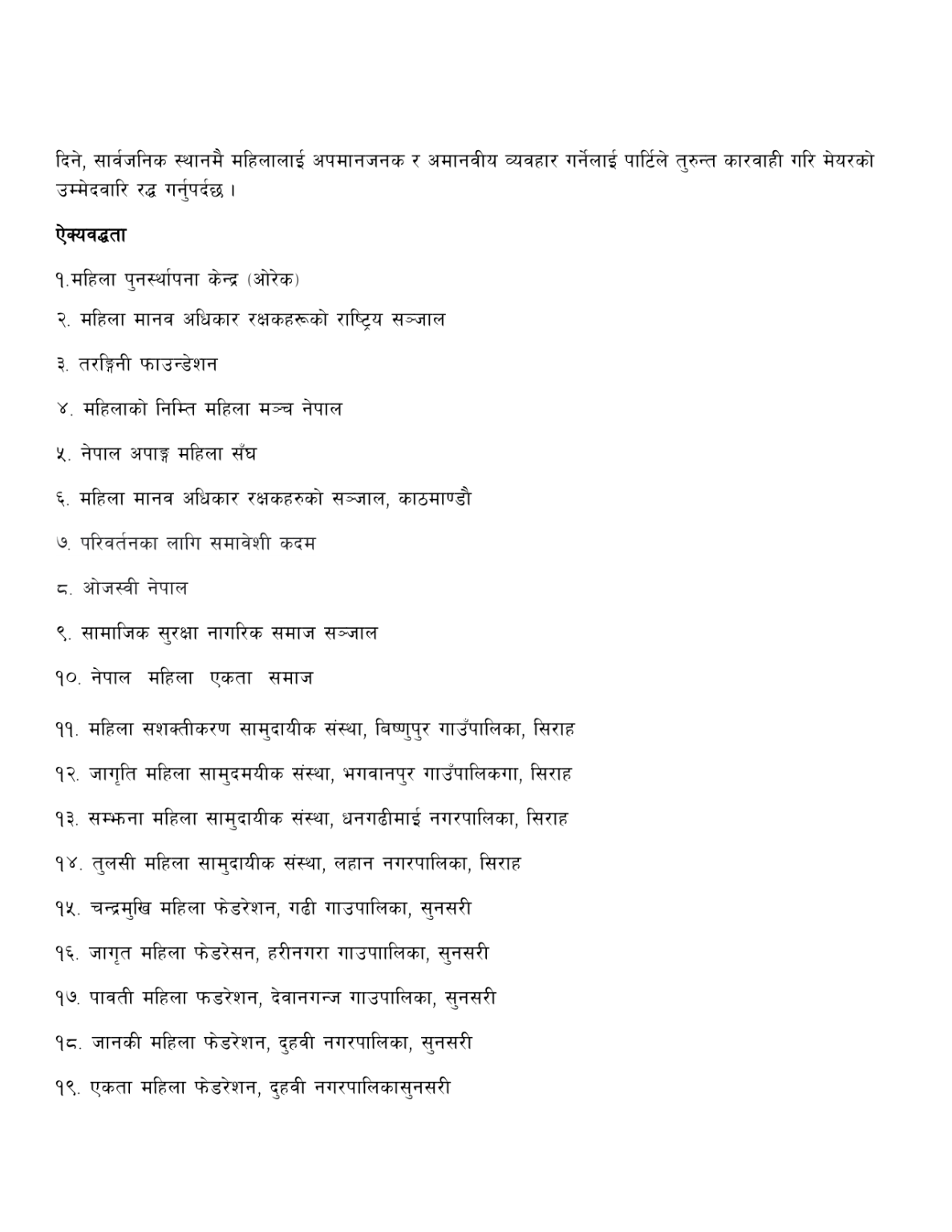 काठमाण्डु – महिला अधिकारका क्षेत्रमा काम गर्ने विभिन्न ४५ संघसंस्थाले काठमाण्डु महानगरपालिकाको मेयर पदका उम्मेदवार केशव स्थापितको उम्मेदवारी रद्ध गर्न माग गरेको छन् ।