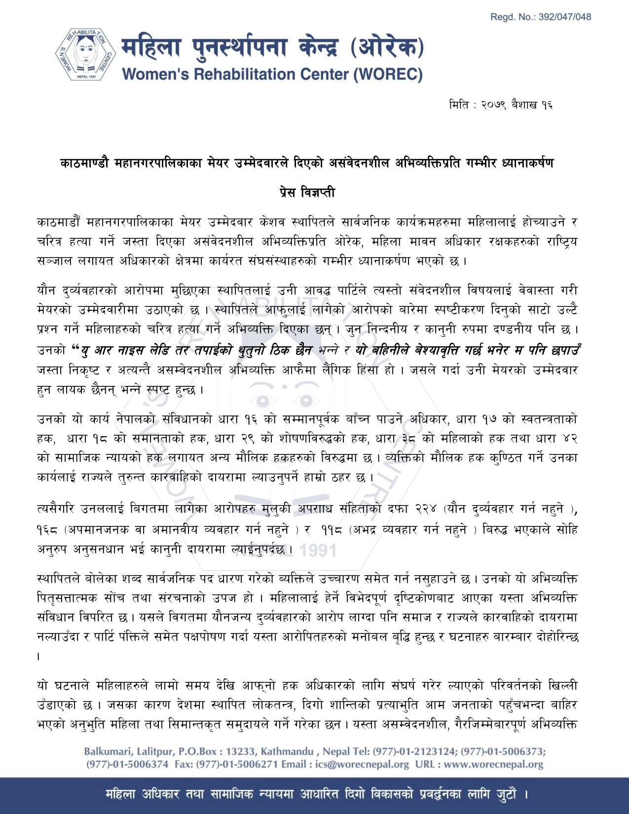 महिला अधिकारको क्षेत्रमा काम गर्ने महिला पुनर्स्थापना केन्द्र (ओरेक) सहित ४५ संघसंस्थाले संयुक्त विज्ञप्ति जारी गर्दै स्थापितको उम्मेदवारी रद्ध गर्न माग गरेका हुन् ।
