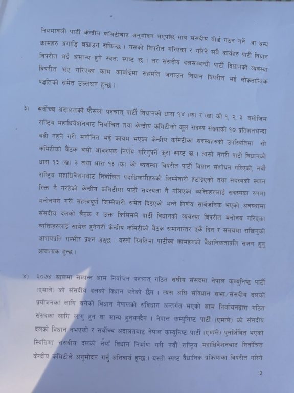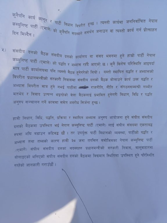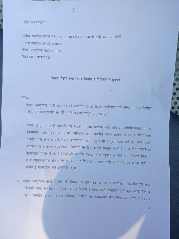 शनिबार बालुवाटारमा एमाले संसदीय दलको बैठक बसिरहेका बेला पुगेका नेपाल–खनाल समूहका तीन सांसदले पाँचबुँदे मागपत्र बुझाएका हुन् । संस्थापक समूहले आज बालुवाटारमा राखेको बैठक खनाल–नेपाल समूहले बहिस्कार गरेको थियो ।