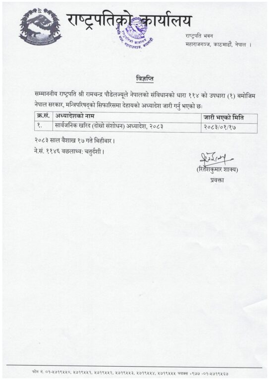काठमाण्डु – राष्ट्रपति रामचन्द्र पौडेलले सार्वजनिक खरिद (दोस्रो संशोधन) अध्यादेश, २०८३ जारी गरेका छन् ।