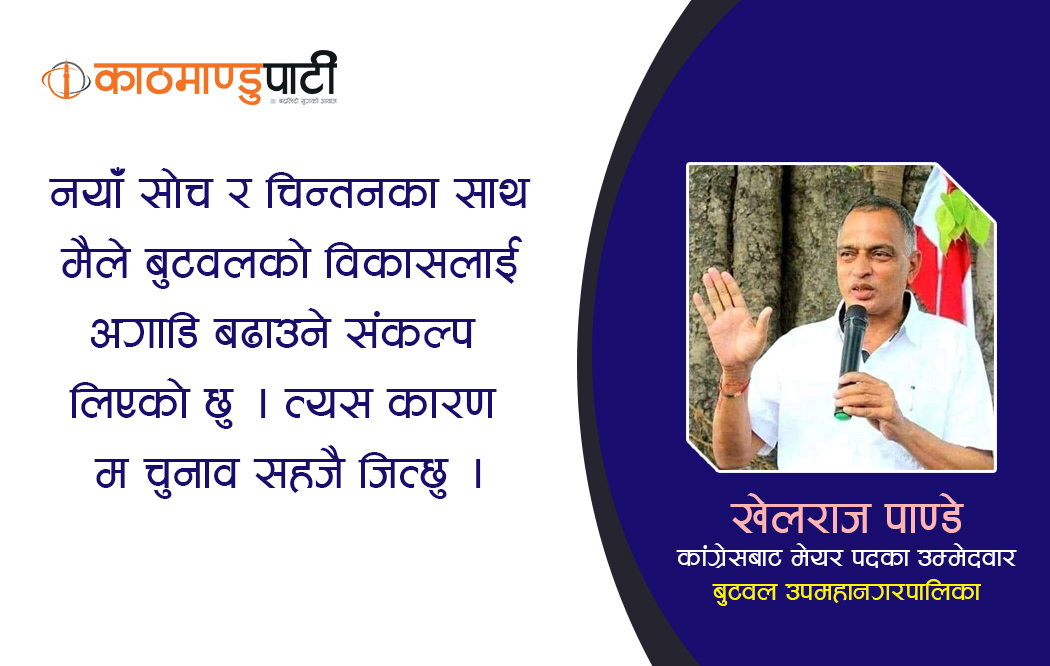 काठमाण्डु- बुटवल उपमहानगरपालिकामा नेपाली कांग्रेसले खेलराज पाण्डेलाई मेयर पदमा उठाएको छ । कांग्रेसका नगर सभापति रहेका उनी सत्तारुढ गठबन्धनबाट उम्मेद्वार बनेका हुन् । यद्यपि, जनता समाजवादी पार्टी (जसपा) यो गठबन्धनमा छैन ।