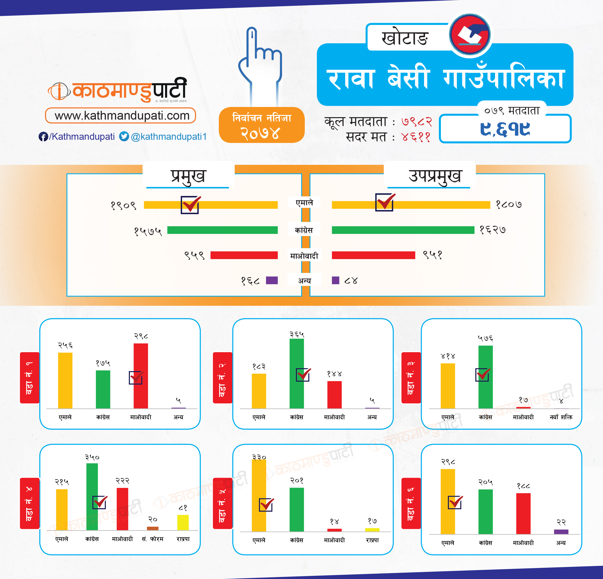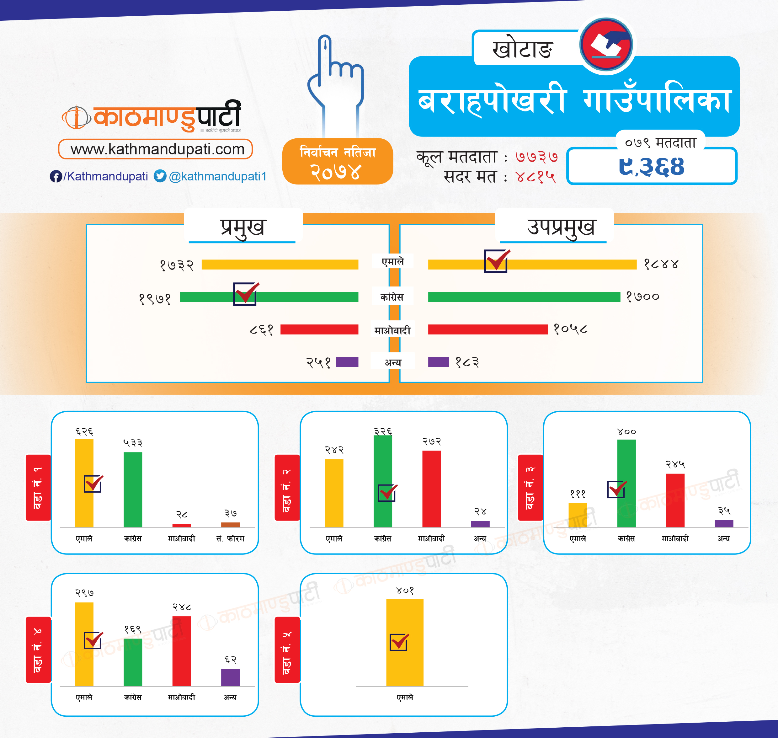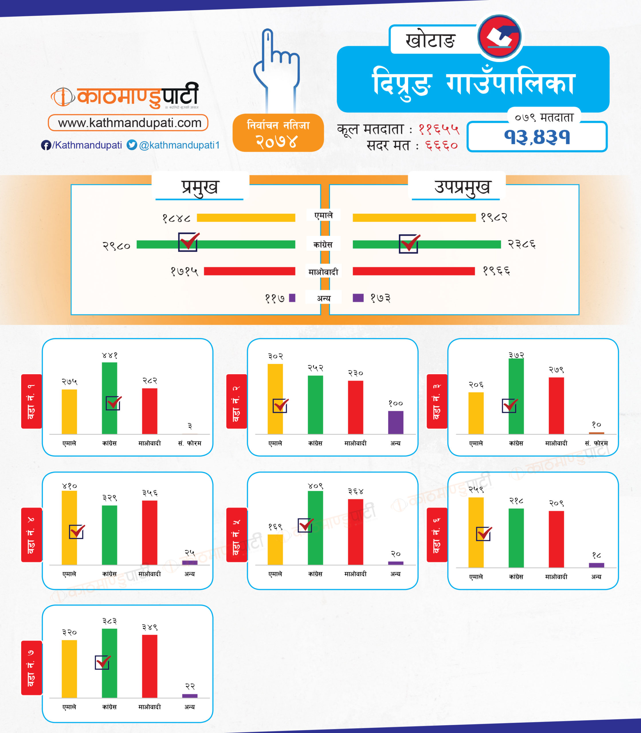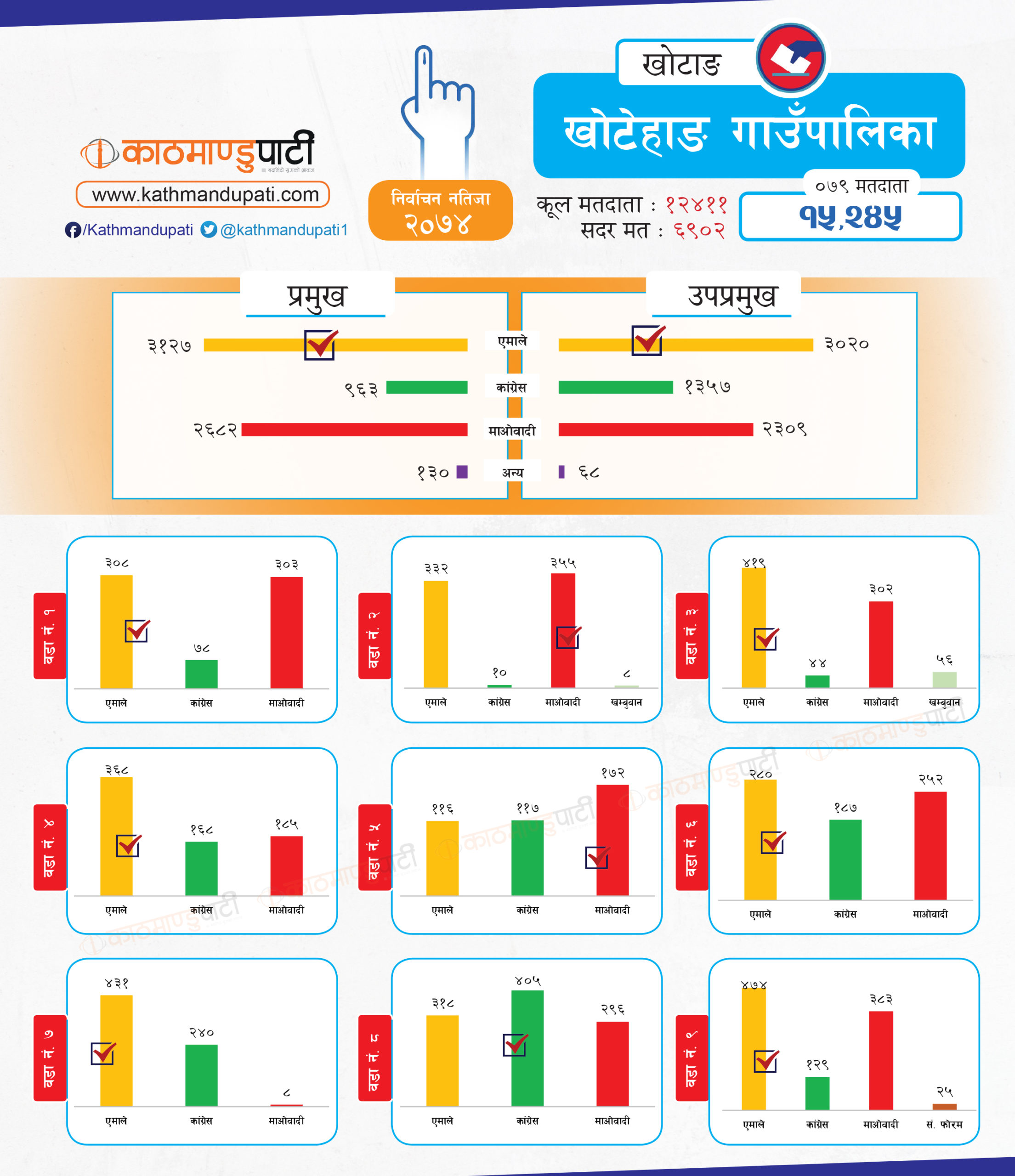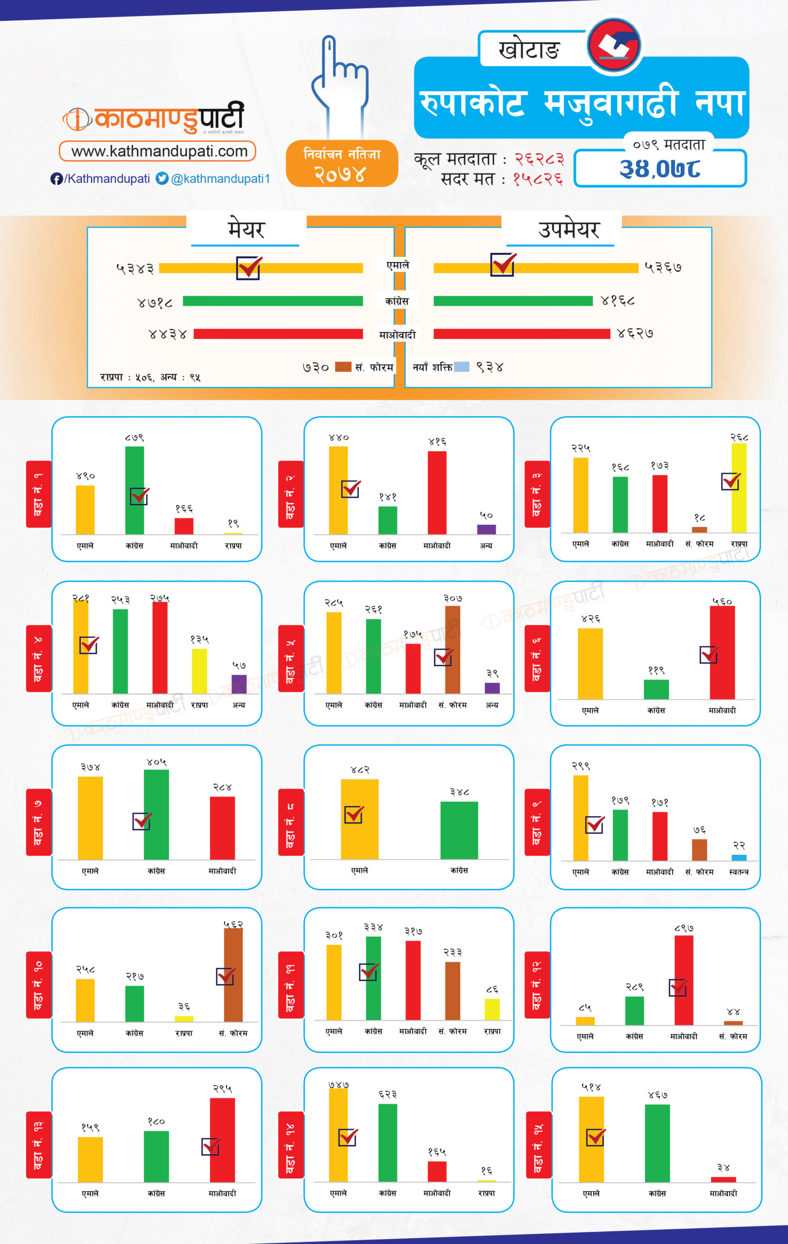 तालमेलअनुसार रूपाकोट–मझुवागढी नगरपालिकाको मेयर कांग्र्रेस र उपमेयर माओवादीले लिएको छ । बराहपोखरी गाउँपालिकामा अध्यक्ष कांग्रेस र उपाध्यक्ष एकीकृत समाजवादीले पाएको छ । रावाबेसीमा अध्यक्ष कांग्रेस र उपाध्यक्ष माओवादी तथा खोटेहाङ, जन्तेढुंगा, ऐंसेलुखर्क गाउँपालिकाको अध्यक्ष माओवादी केन्द्रलाई दिने गरी तालमेल भएको छ । ती गाउँपालिकामा उपाध्यक्ष कांग्रेसले लिएको छ ।