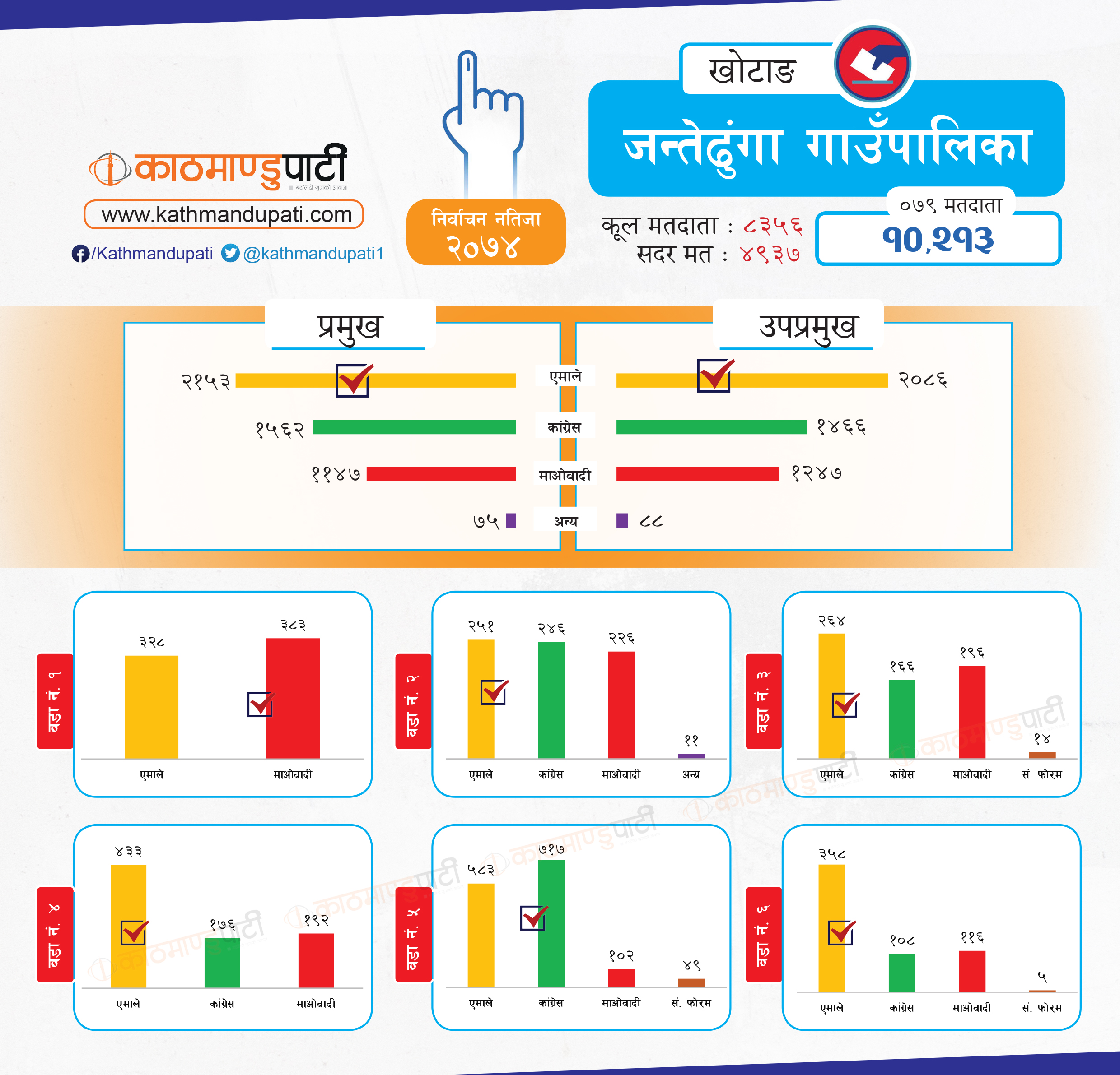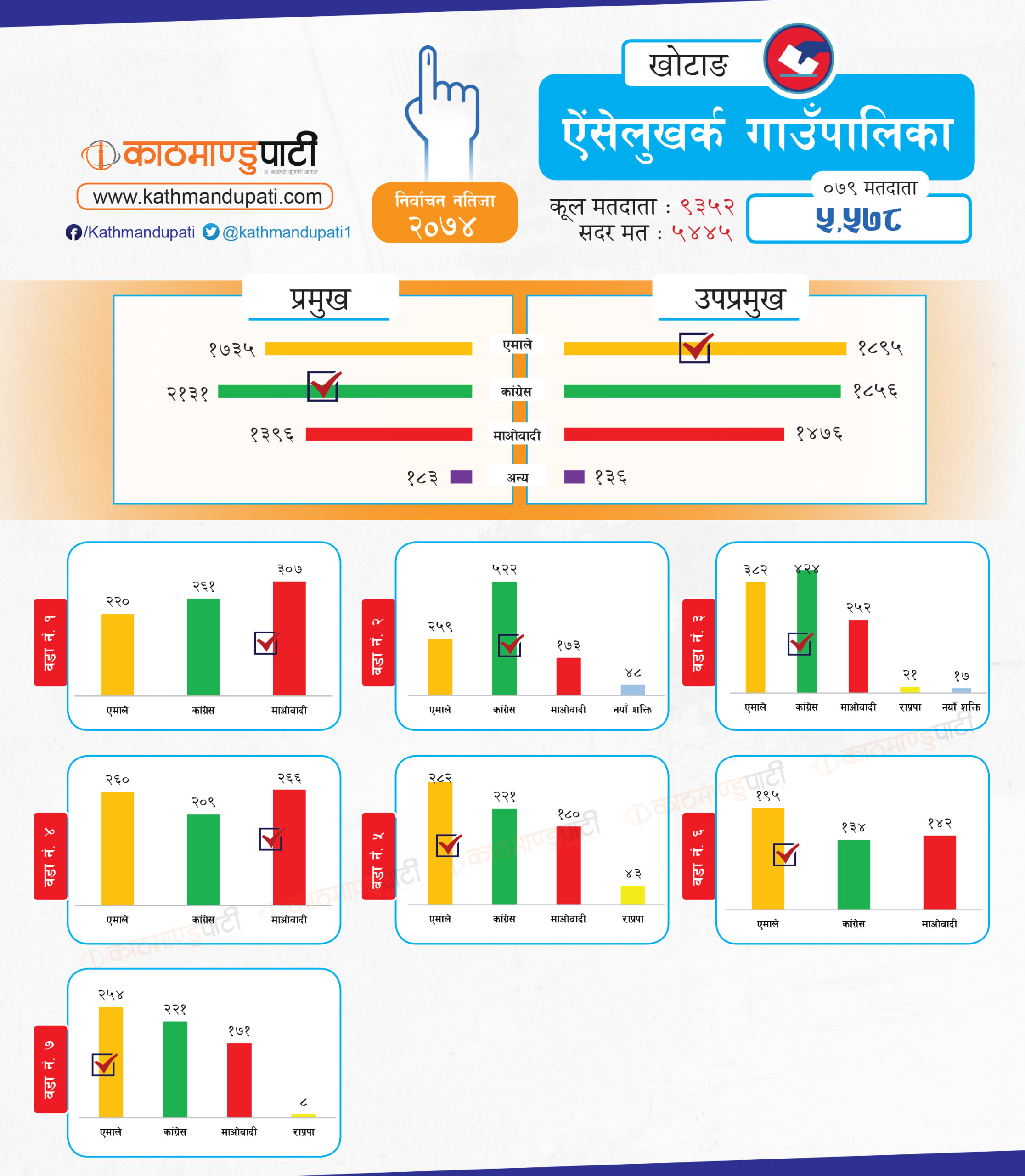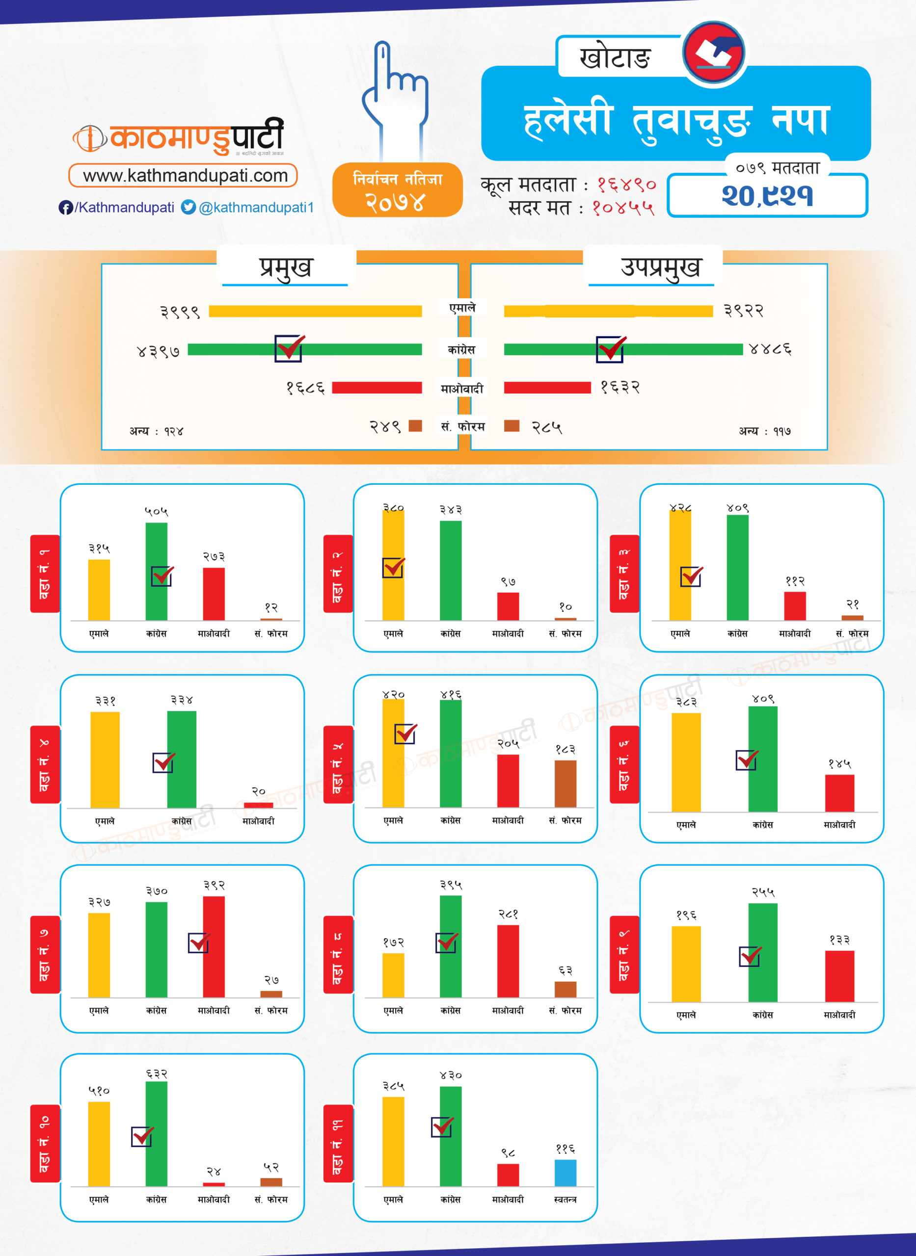 कांग्रेसले हलेसी–तुवाचुङ नगरपालिकाको मेयर–उपमेयर जित्यो । यस्तै, उसले दिप्रुङ गाउँपालिकामा अध्यक्ष–उपाध्यक्ष तथा ऐंसेलुखर्क र बराहपोखरीको अध्यक्ष र साकेलाको उपाध्यक्ष पनि जितेको थियो । माओवादी केन्द्रले साकेलाको अध्यक्ष मात्रै जित्यो । जिल्लाका १० मध्ये ६ वटा पालिकामा सत्ता गठबन्धनका दलबीच तालमेल भएको छ । चारवटामा भने छुट्टाछुट्टै प्रतिस्पर्धा गर्ने गरी उम्मेदवारी दिइएको छ ।