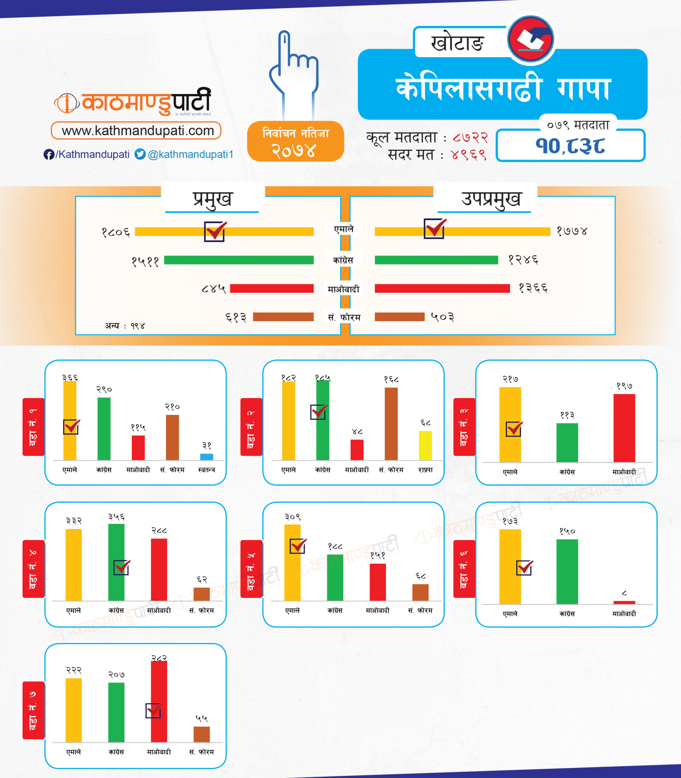 अघिल्लो चुनावका आधारमा जिल्लामा एमाले पहिलो दल हो । उसले १० मध्ये पाँचवटा पालिकामा प्रमुख र उपप्रमुख नै जितेको थियो । कांग्रेसले चारवटा प्रमुख जित्न सफल भएको थियो भने माओवादीले एउटामा सफलता पाएको थियो । एमालेले रूपाकोट–मजुवागढी नगरपालिकाको मेयर–उपमेयरसहित कोपिलासगढी, खोटेहाङ, जन्तेढुंगा र राराबेसी गाउँपालिकामा अध्यक्ष–उपाध्यक्ष नै जित्यो । यस्तै, ऐंसेलुखर्क र बराहपोखरी गाउँपालिकाको उपाध्यक्ष पनि जित्न सफल भयो ।
