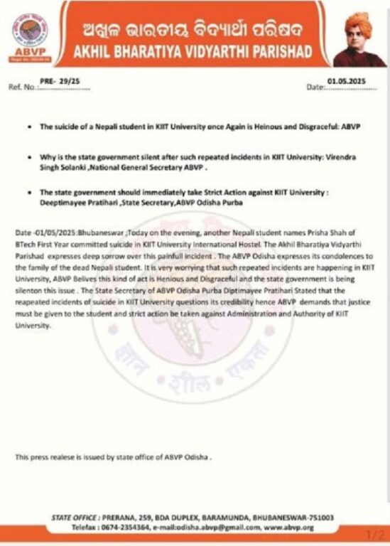 एबीभीपीले विज्ञप्ति निकाल्दै केआईआईटीमा पुनः एकपटक नेपाली विद्यार्थीले आत्महत्या गर्न बाध्य हुनु घिनलाग्दो र लज्जास्पद भएको जनाएको छ ।