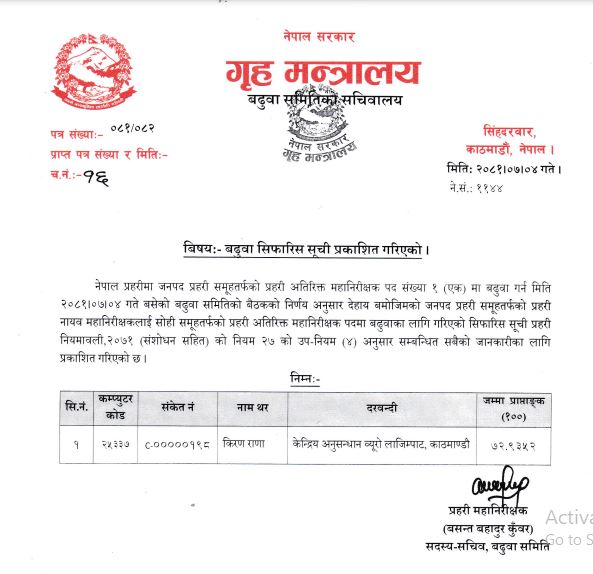 गृहसचिव गोकर्णमणि दुवाडी अध्यक्ष रहेको बढुवा समितिले आइतबार सिनियर दुई डीआईजीपी बुद्धिराज गुरुङ र दुर्गा सिंह चन्दलाई पञ्छाएर १५ कात्तिकमा ५६ वर्षे उमेर हदका कारण अनिवार्य अवकाशमा जान लागेकी राणालाई बढुवा सिफारिस गरेको हो । समितिमा प्रधानमन्त्री तथा मन्त्रिपरिषद् कार्यालयको सचिव सदस्य र प्रहरी महानिरीक्षक सदस्यसचिव रहने व्यवस्था कानुनमा छ ।