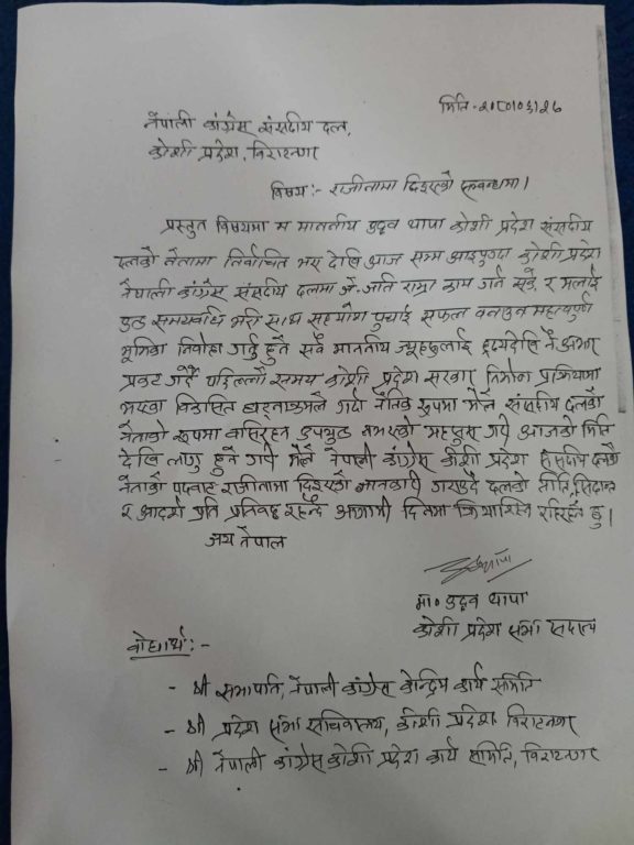 नेता थापाले दल र पार्टीको निर्णय कार्यान्वयन गर्न नसकेको भन्दै राजीनामा दिएको बताए । कोशी प्रदेश सरकार निर्माणका क्रममा देखिएको घटनाक्रमप्रति आफू पनि कारक रहेकाले राजीनामा दिएको उनको भनाइ छ ।