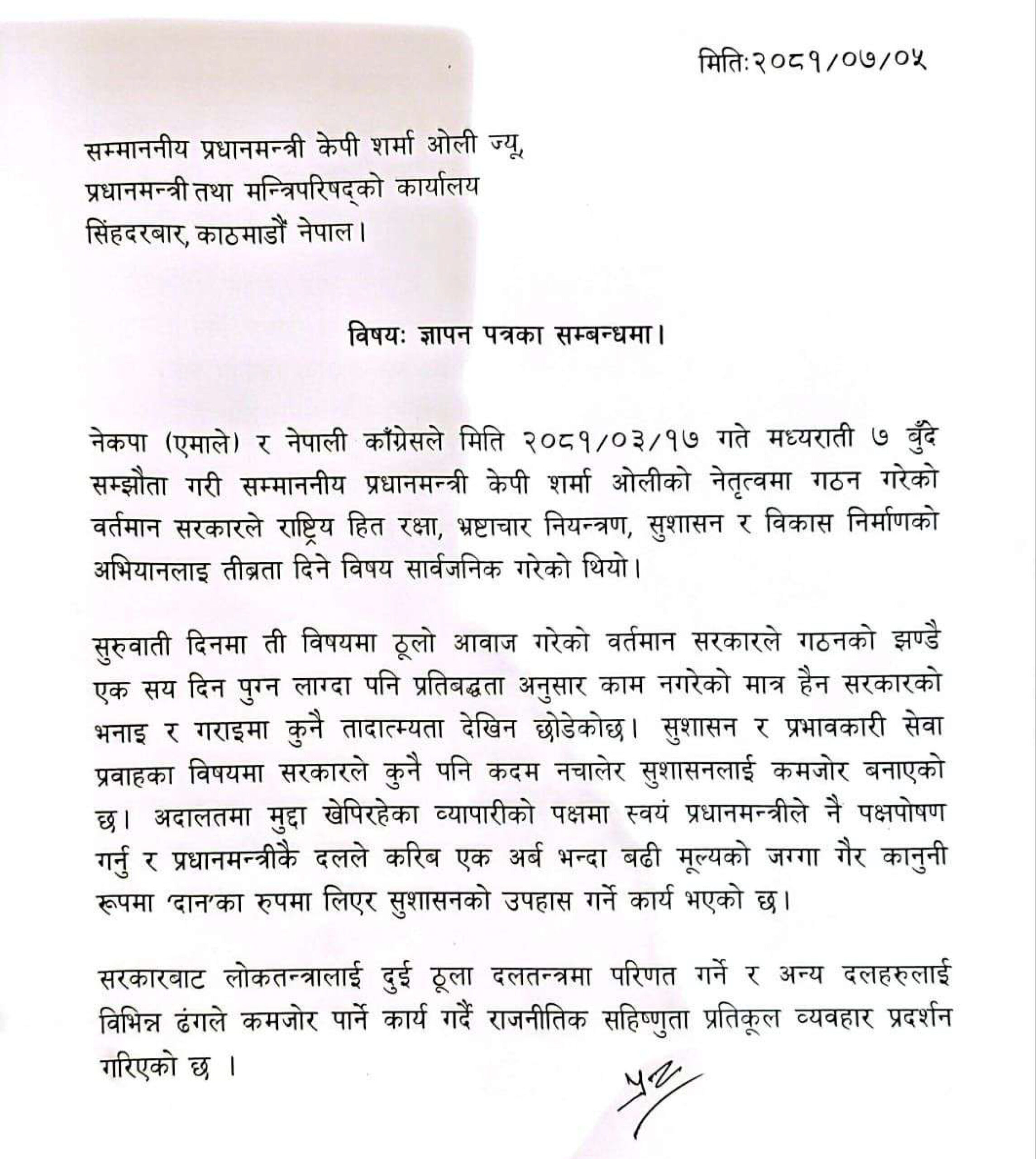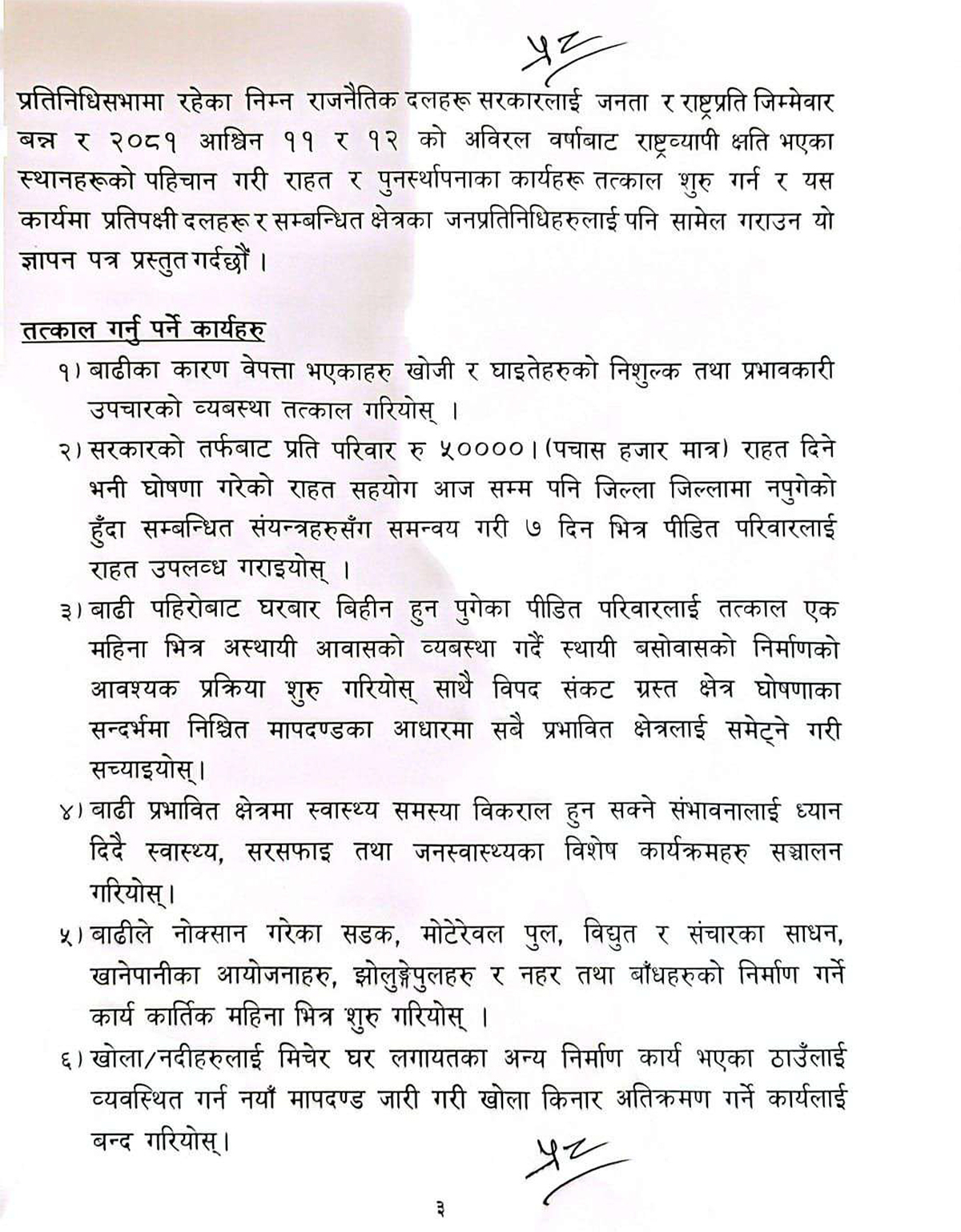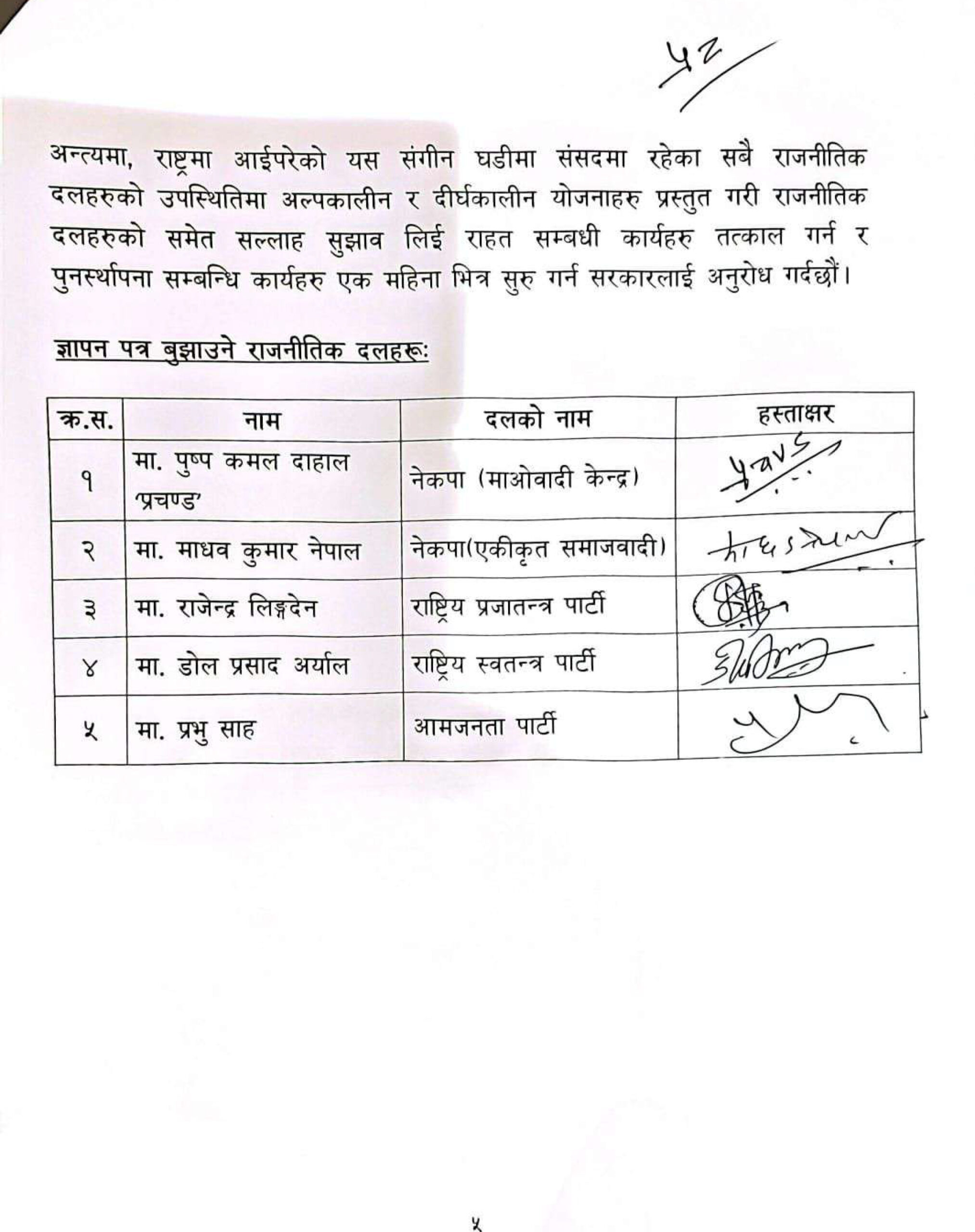 सोमबार साँझ ८ बजे प्रधानमन्त्री निवास बालुवाटार पुगेर ज्ञापनपत्र बुझाएका विपक्षीहरूले तानाशाही लाद्ने प्रयास नगर्न चेतावनी दिए ।