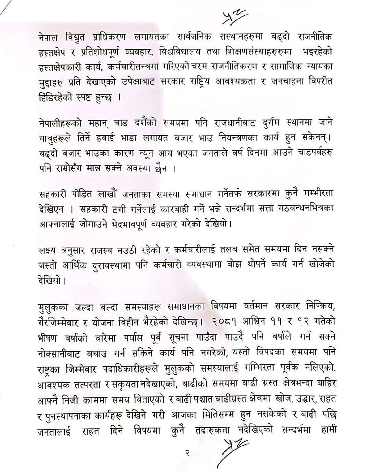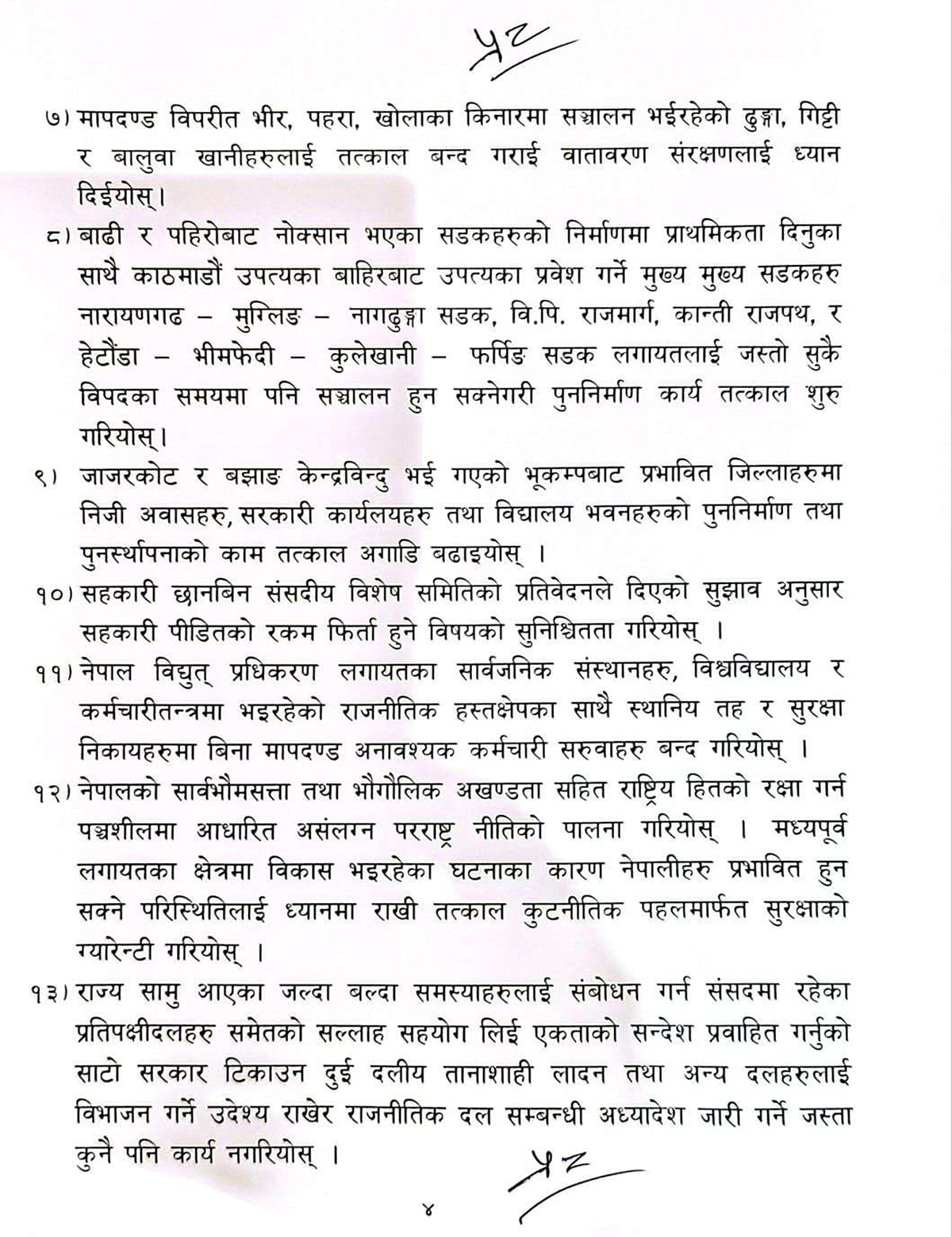 ज्ञापन पत्रमा भनिएको छ, ‘राज्यसामु आएका जल्दाबल्दा समस्याहरूलाई सम्बोधन गर्न संसद्मा रहेका प्रतिपक्षी दलहरू समेतको सल्लाह सहयोग लिई एकताको सन्देश प्रवाहित गर्नुको साटो सरकार टिकाउन २ दलीय तानाशाही लाद्न तथा अन्य दलहरूलाई विभाजन गर्ने उद्देश्य राखेर राजनीतिक दल सम्बन्धी अध्यादेश जारी गर्ने जस्ता कुनै पनि कार्य नगरियोस् ।’