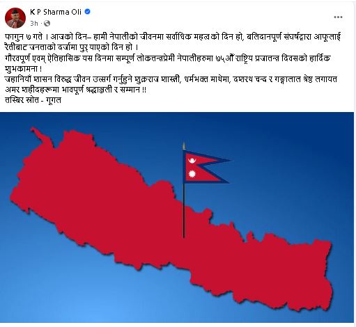 ‘फागुन ७ गते । आजको दिन हामी नेपालीको जीवनमा सर्वाधिक महत्वको दिन हो, बलिदानपूर्ण सङ्घर्षद्वारा आफूलाई रैतीबाट जनताको दर्जामा पुर्याएको दिन हो’, प्रधानमन्त्री ओलीले भनेका छन् ।