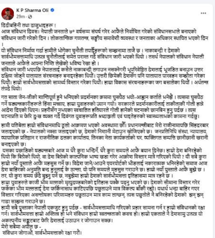 ‘‘गत साता जेन जीको शान्तिपूर्ण हुने भनिएको प्रदर्शनका क्रममा घुसपैठ भयो, आह्वानकर्ताले भनेझैं। त्यसमा घुसपैठ गर्ने षड्यन्त्रकारीहरूले हिंसा मच्चाए, हाम्रा युवाहरुको ज्यान गयो,’ ओलीले सन्देशमा भनिएको छ, ‘सरकारले प्रदर्शनकारीलाई ताकीताकी गोली हान्ने आदेश दिएको थिएन। प्रहरीसँग नभएका स्वचालित हतियारले गोली हानेको घटनाको छानबिन हुनु पर्दछ। त्यस घटनाप्रति म फेरि दुःख व्यक्त गर्दै दिवंगत युवाहरूप्रति श्रध्दाञ्जली एवं घाइतेहरुको स्वास्थ्यलाभको कामना गर्दछु।’