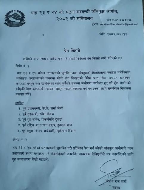आईतबारको मन्त्रिपरिषद् बैठकले जेनजी आन्दोलन दमनबारे जाँचबुझ गर्न गठित आयोगको सिफारिसमा ५ जनालाई विदेश जान रोक लगाएको छ ।