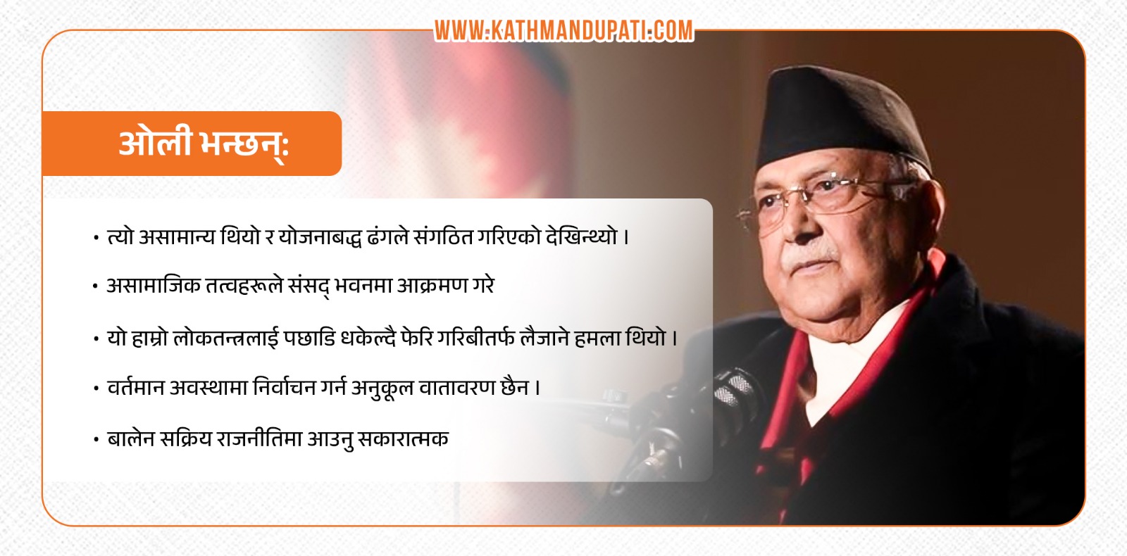 आरटी इन्डियासँगको अन्तर्वार्तामा ओलीले भने, ‘त्यो सामान्य र नियमित घटना थिएन । त्यो असामान्य थियो, र अचानक घट्न सक्ने कुरा थिएन । त्यो योजनाबद्ध ढंगले संगठित गरिएको देखिन्थ्यो ।’