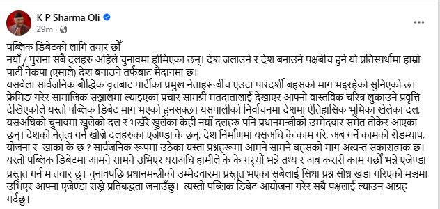 सामाजिक सञ्जाल फेसबुकमा लेख्दै उनले सबै दलका प्रधानमन्त्री उम्मेदवारहरूसँग सार्वजनिक बहस (पब्लिक डिबेट)गर्न आफू पूर्ण रूपमा तयार रहेको घोषणा गरेका छन्।