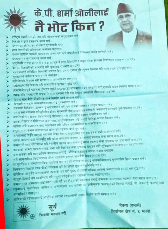 ओलीले समग्रमा विकास, सुशासन, रोजगारी, शिक्षा, स्वास्थ्य र राष्ट्रिय स्वाभिमानको संरक्षणलाई प्राथमिकतामा राख्दै सूर्य चिह्नमा मतदान गर्न मतदातासँग अपिल गरेका छन् ।