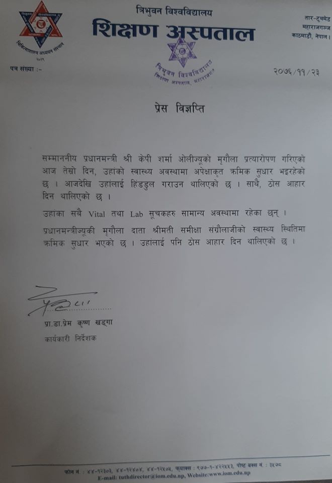 प्रधानमन्त्रीलाई सात दिनभित्र अस्पतालबाट फर्काइने त्रिवि शिक्षण अस्पतालका कार्यकारी निर्देशक प्रेमकृष्ण खड्गाले जानकारी दिए । प्रधानमन्त्रीको स्वास्थ्यवस्थाबारे नियमित जानकारी दिइने प्रेस सल्लाहकार थापाले बताए ।
