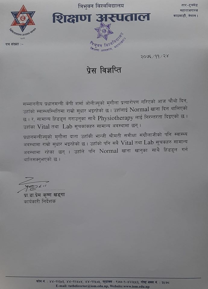 ‘उहाँको भाइटल तथा ल्याब सूचकांकहरु सामान्य अवस्थामा छन्’ अस्पातालले विज्ञप्ति जारी गर्दै भनेको छ ।