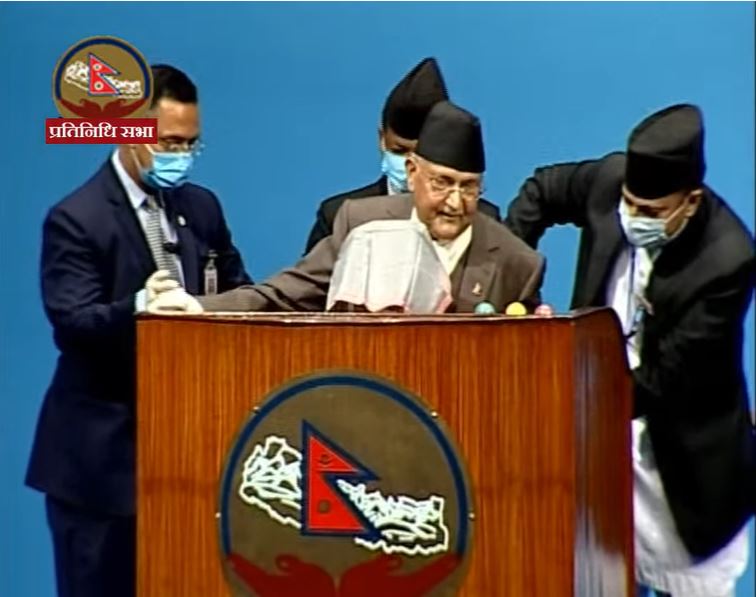उनले शल्यक्रियाका कारण खुट्टामा समस्या भएकाले उभिन गाह्रो भएको बताए । सभामुख सापकोटाले प्रधानमन्त्री ओलीलाई आफ्नो सिटमै गएर सम्बोधन गर्न आग्रह गरे पनि उनले अगाडि बसेर बोल्दा सबैतिर देखिने भएकाले रोस्ट्रमबाटै सम्बोधन गर्ने इच्छा व्यक्त गरेका थिए ।