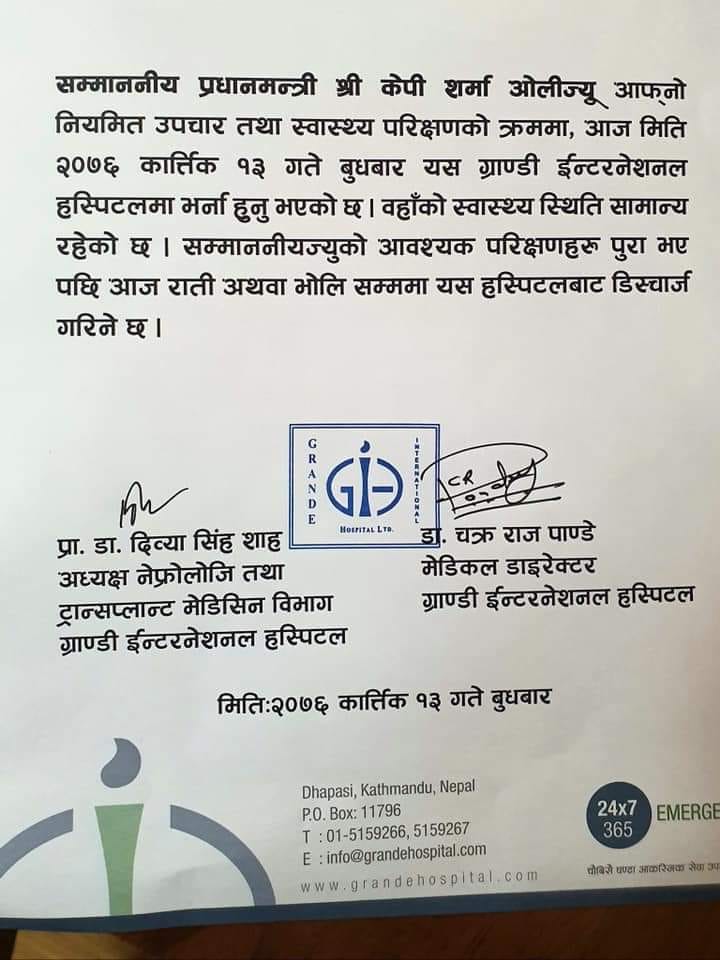 प्रधानमन्त्री ओलीका निजि चिकित्सक डाक्टर दिव्यासिंह शाह र ग्राण्डी इन्टरनेसनल हस्पिटलका मेडिकल डाइरेक्टर डाक्टर चक्रराज पाण्डेले हस्ताक्षर गरेको संयुक्त विज्ञप्तिमा ओलीको स्वास्थ्यपरीक्षण सकिएपछि बुधवार साँझ या बिहीवारसम्म डिस्चार्ज गरिने बताइएको छ ।