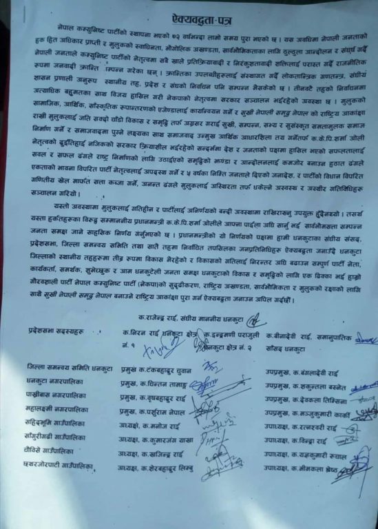 काठमाण्डु – धनकुटामा नेपाल कम्युनिष्ट पार्टीबाट प्रतिनिधि सदस्य, प्रदेश सभा सदस्य र जिल्लाका सात वटै स्थानीय तहका प्रमुख र उपप्रमखहरुले केपी शर्मा ओली नेतृत्वको नेकपामा लाग्ने निर्णय गरेका छन् ।