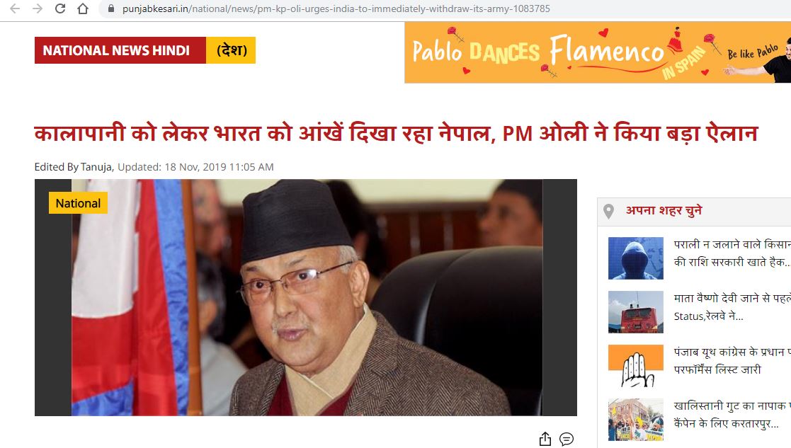 अमर उजालाको अनलाइन संस्करण लेख्छ, ‘नेपाल के प्रधानमंत्री ओली का एलान, काला पानी इलाके से हटाए जाएंगे भारतीय सैनिक’