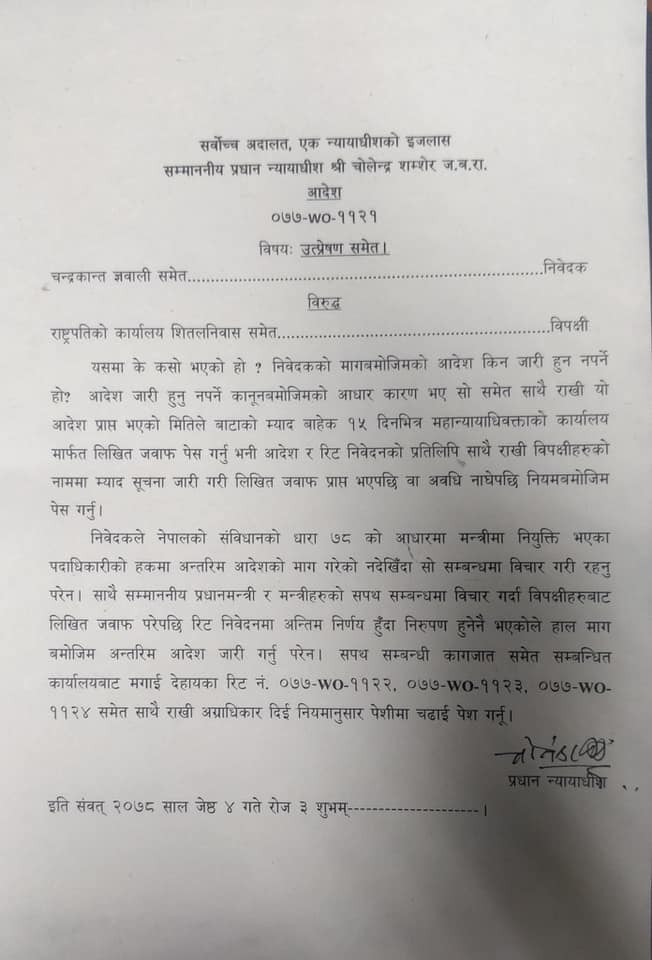 सर्वोच्चले राष्ट्रपति र प्रधानमन्त्रीको कार्यालयलाई १५ दिनभित्र लिखित जवाफ पेश गर्न आदेश दिएको छ । आदेशमा निवेदकको माग बमोजिम आदेश किन जारी हुनु नपर्ने हो ? आदेश जारी हुनु नपर्ने कानुन बमोजिमको आधार कारण भए १५ दिनभित्र महान्यायाधिवक्ताको कार्यालय मार्फत लिखित जवाफ पेश गर्न आदेश दिएको हो ।