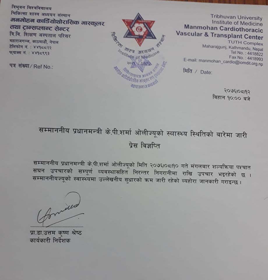 मंगलबार महराजगञ्जस्थित मनमोहन कार्डियोथोरासिक भास्कुलर तथा ट्रान्सप्लान्ट सेन्टरमा प्रधानमन्त्री ओलीको एपेन्डिसाइटिसको शल्यक्रियाका भएको हो ।