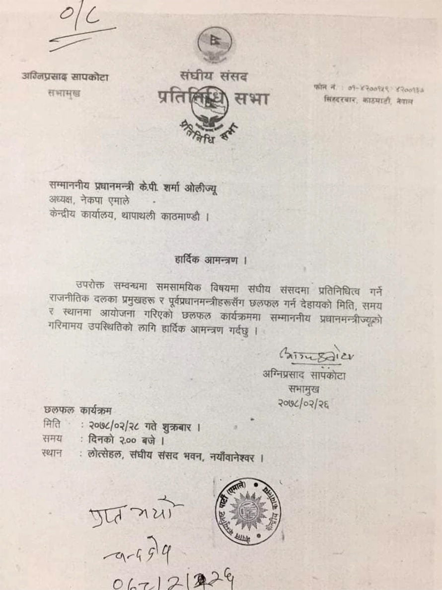 सभामुख सापकोटाले शुक्रबार संसद भवन नयाँ बानेश्वरस्थित ल्होत्से हलमा प्रधानमन्त्री र पूर्वप्रधानमन्त्रीसहितको सर्वदलीय बैठक बोलाएका छन् ।