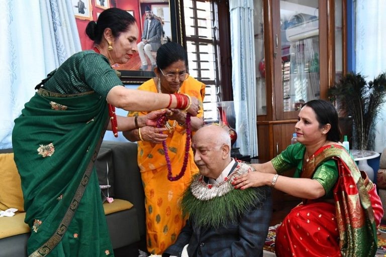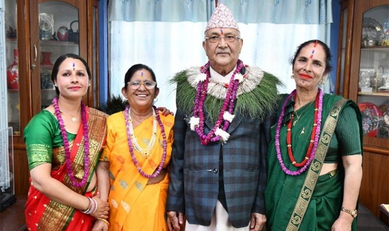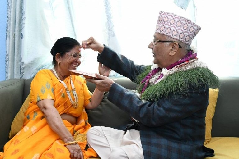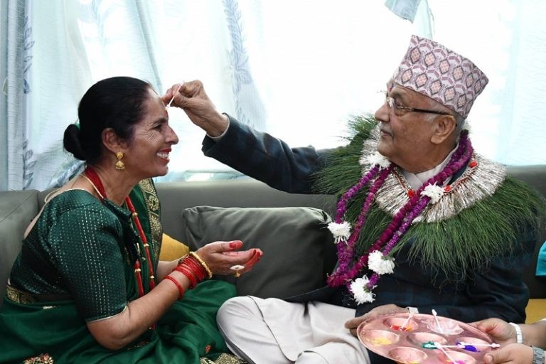 अध्यक्ष ओलीलाई भक्तपुरको बालकोटस्थित आफ्नै निवासमा दिदीबहिनी विष्णुमाया ढकाल, कौशल्या कोइराला र विष्णु कुमारी पौडेलले भाइटीका लगाइदिएका हुन् ।