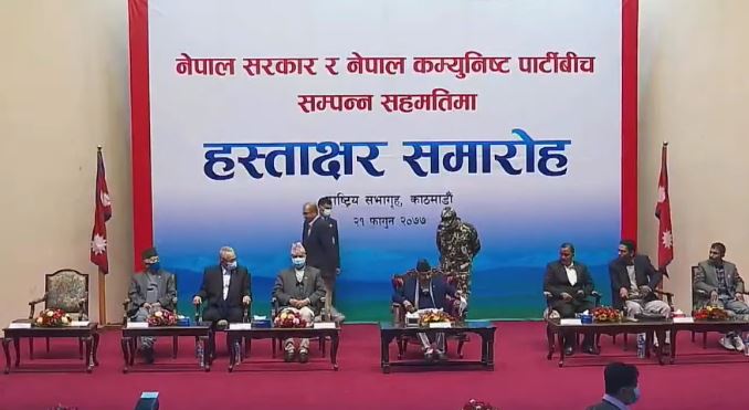 बिहीबार सरकार र नेकपाबीच भएको तीन बुँदे सहमतिमा हस्ताक्षर तथा त्यसपछि आयोजित सभालाई सम्बोधन गर्न प्रधानमन्त्री ओली र महासचिव विप्लव राष्ट्रिय सभागृह पुगेका छन् ।