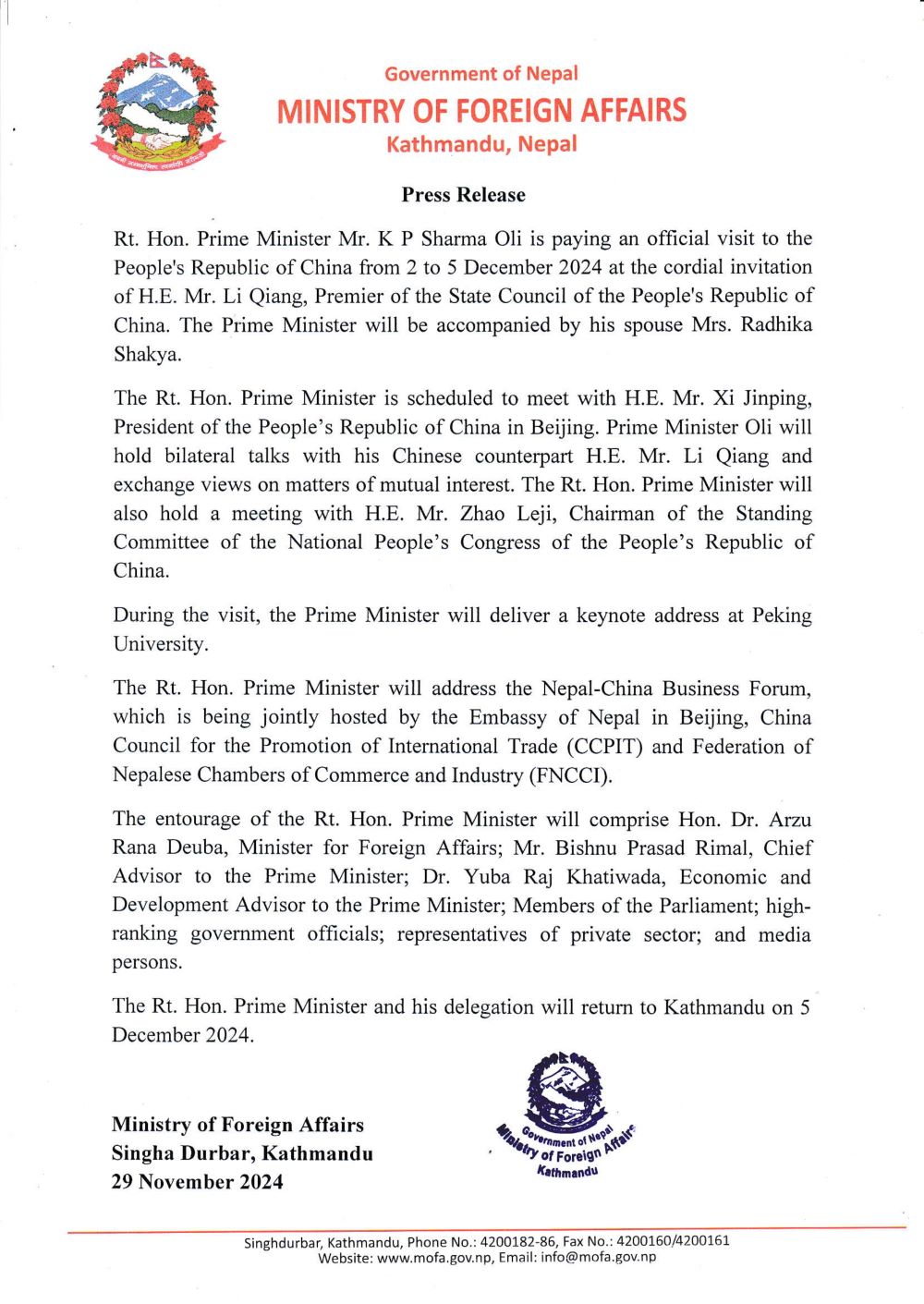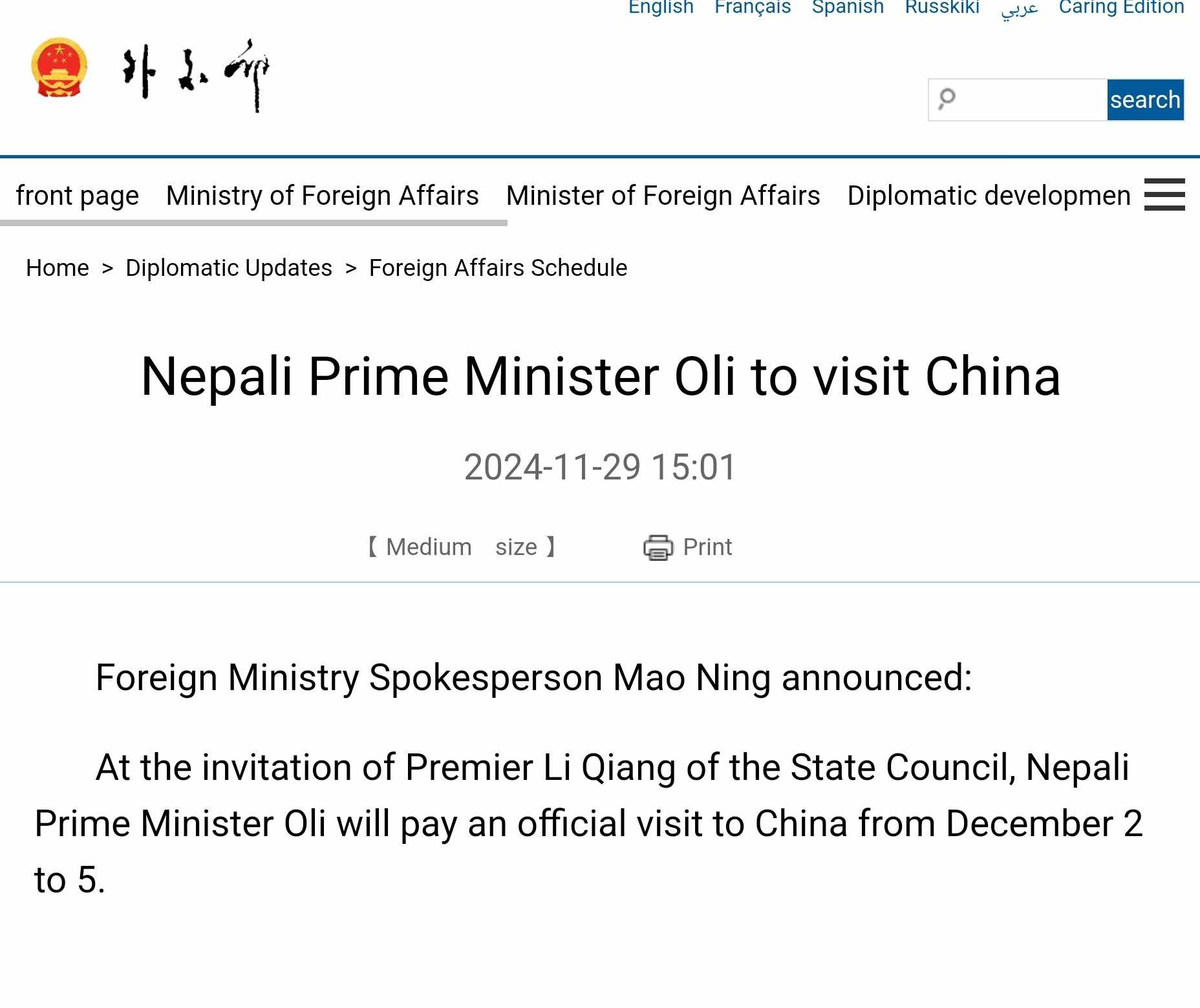 चिनियाँ विदेश मन्त्रालयका प्रवक्ता माओ निङले राज्य परिषद्का प्रधानमन्त्री ली छ्याङको निमन्त्रणामा नेपालका प्रधानमन्त्री ओलीले डिसेम्बर २ देखि ५ सम्म चीनको औपचारिक भ्रमण गर्ने घोषणा गरेको विज्ञप्ति जारी गरेका छन् ।