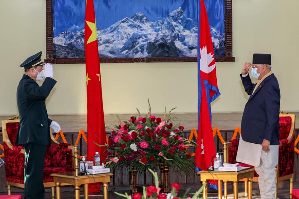 आइतबार एक दिने नेपाल भ्रमणमा आएका रक्षामन्त्री फेङ्हे र रक्षामन्त्रीसमेत रहेका प्रधानमन्त्री ओलीबीच बालुवाटारमा भेटवार्ता भएको हो । सँग भेट गरेका हुन् ।