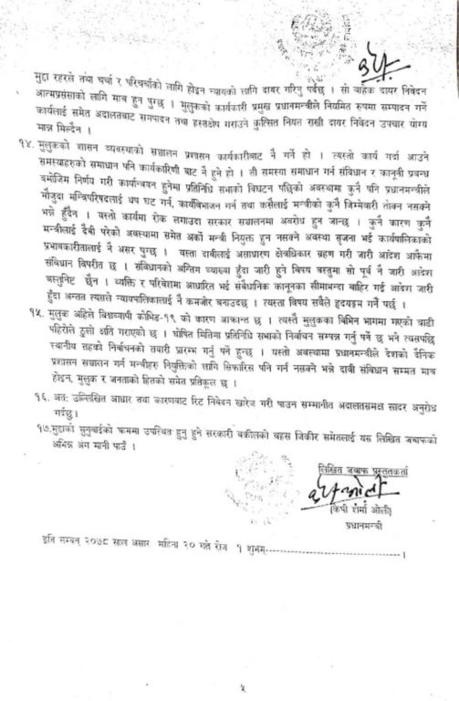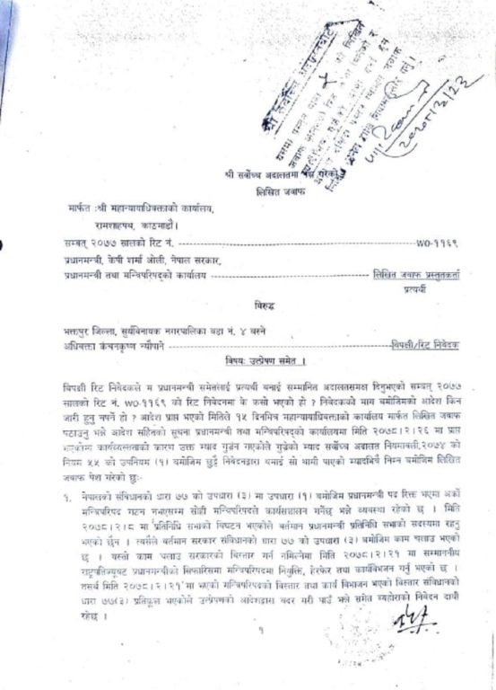 काठमाण्डु – प्रधानमन्त्री केपी शर्मा ओलीले प्रतिनिधि सभा विघटनपछि मन्त्रिपरिषद् विस्तार गरेकोबारे सर्वोच्च अदालतमा लिखित जवाफ पेशका छन् । प्रधानमन्त्री ओलीले महान्यायाधिवक्ताको कार्यालयमार्फत लिखित जवाफ पेश गरेका हुन् ।