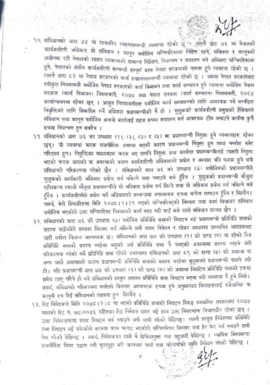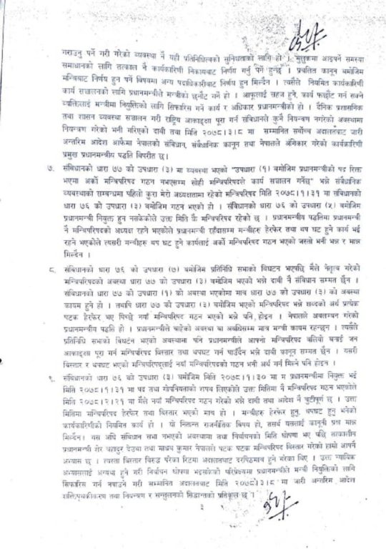 उनले संसद विघटनपछि प्रधानमन्त्रीलाई मन्त्रिपरिषद थपघट र कार्यविभाजन गर्न रोक लगाउनु संविधानविपरीत भएको बताएका छन । ‘कुनै कारण कुनै मन्त्रीलाई दैवी परेको अवस्थामा समेत अर्को मन्त्री नियुक्त हुन नसक्ने अवस्था सिर्जना भई कार्यपालिकाको प्रभावकारितामा नै असर पर्छ, यस्ता दावीलाई असाधारण क्षेत्राधिकार ग्रहण गरी जारी आदेश आफैंमा संविधान विपरीत छ’ उनले लिखित जवाफमा भनेका छन् ।