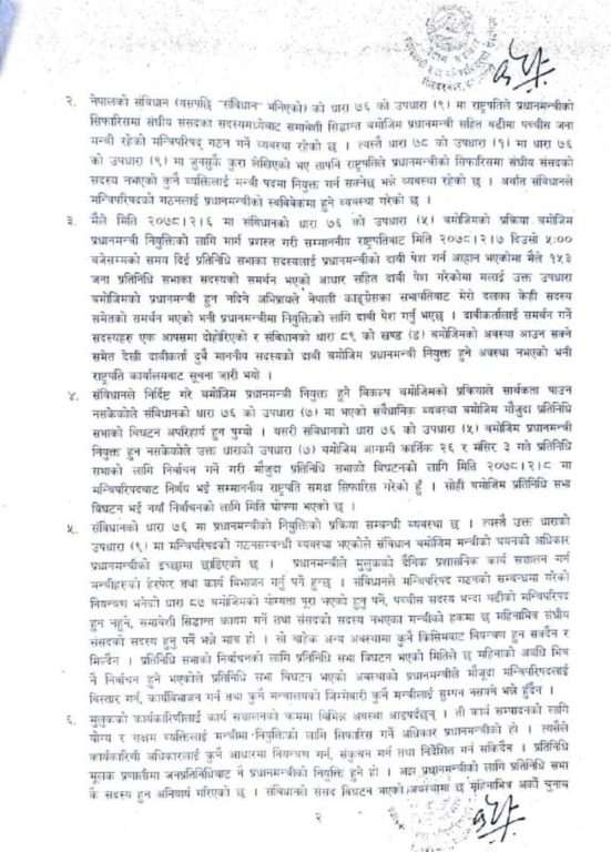 संविधानको धारा ७७ मा प्रधानमन्त्री पद रिक्त भएमा अर्को मन्त्रिपरिषद गठन नभएसम्मका लागि सोही मन्त्रिपरिषदले कार्यसञ्चालन गर्न पाउने व्यवस्था रहेको उल्लेख गरेका छन् ।