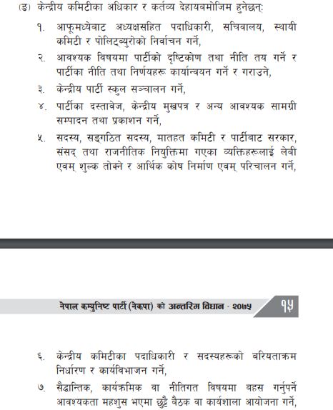 नेकपाको अन्तरिम विधानको दफा १८ ले अध्यक्षद्वयलाई सातवटा समान अधिकार प्रत्यायोजन गरेको छ । विधानले तोकेको परिभाषित जिम्मेवारीअनुसार अध्यक्षद्वयले राष्ट्रिय परिषद्, केन्द्रीय कमिटी, पोलिट्ब्युरो, स्थायी कमिटी र केन्द्रीय सचिवालय बैठकको अध्यक्षता गर्नेछन् । पार्टीको प्रमुख नेताका रूपमा समग्र पार्टीको नेतृत्व गर्नेछन् ।