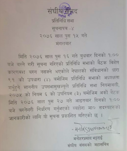 गत असोजदेखि रिक्त रहेको सभामुख चयनको विषयमा नेकपा निष्कर्षमा पुग्न सकेको छैन । सभामुखमा सहमति नभएपछि भोली पुस १६ गतेका लागि बोलाइएको संसद बैठक स्थगित भएको छ । बैठक ११ दिन पछि सारेर प्रतिनिधिसभाको अर्को बैठक यही पुस २७ गते अपराह्न १ बजेका लागि बोलाइएको छ ।