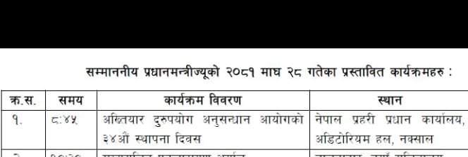 ओलीको सचिवालयले आइतबार साँझ ओलीको सोमबारको कार्याक्रममा अख्तियार दिवसको कार्यक्रम उल्लेख गरेर सञ्चारकर्मीहरूलाई प्रस्तावित कार्यक्रमको रूपमा पठाएको थियो ।
