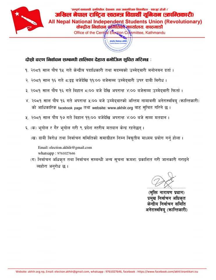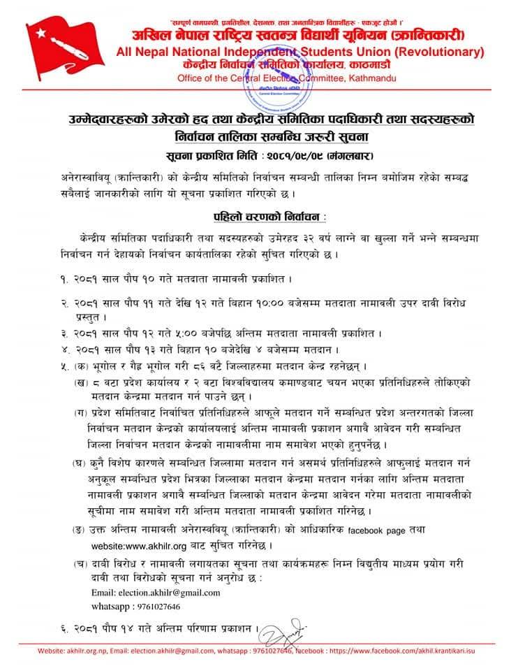 काठमाण्डु – नेकपा माओवादी केन्द्र निकट अखिल क्रान्तिकारीको नेतृत्व चयनका लागि हुने निर्वाचन कार्यतालिका सार्वजनिक भएको छ ।