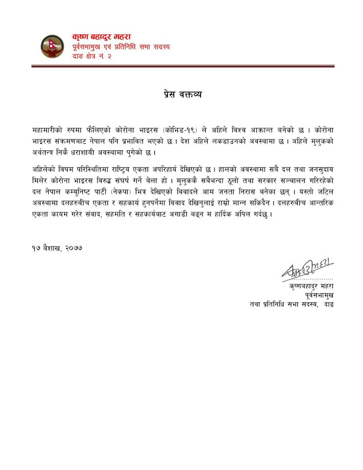 बुधबार एक विज्ञप्ति जारी गर्दै पूर्वसभामुख महराले विश्वव्यापी रुपमा फैलिएको कोरोना भाइरसले नेपाललाई पनि असर गरिरहेकाले नेताहरु भाइरसविरुद्ध लड्न एकजुट हुनुपर्नेमा विभाजनमा जानु दुःखद् भएको बताएका छन् ।