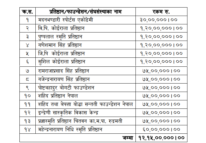 महानगरले मदन भण्डारी स्पोर्टस् एकेडेमीलाई ३० लाख, बीपी कोइराला प्रतिष्ठानलाई १ करोड २० लाख, पुष्पलाल स्मृति प्रतिष्ठानलाई १ करोड २० लाख, गणेशमान सिंह प्रतिष्ठानलाई १ करोड २० लाख, जीपी कोइराला प्रतिष्ठानलाई १ करोड २० लाख, सुशील कोइराला प्रतिष्ठानलाई १ करोड २० लाख वितरण गरिएको छ ।