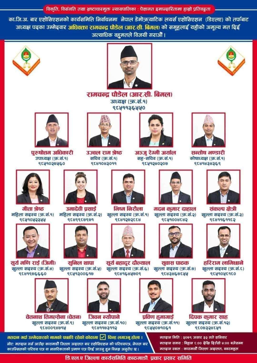 काठमाण्डु – काठमाण्डु जिल्ला बार एसोसियनमा लोकतान्त्रिक समूहको प्यानल नै विजयी भएको छ । नेपाल डेमोक्रेटिक लयर्स एशोसियन (डिएलए)को तर्फ रामचन्द्र पौडेल समूहको प्यानल नै विजयी भएको हो ।