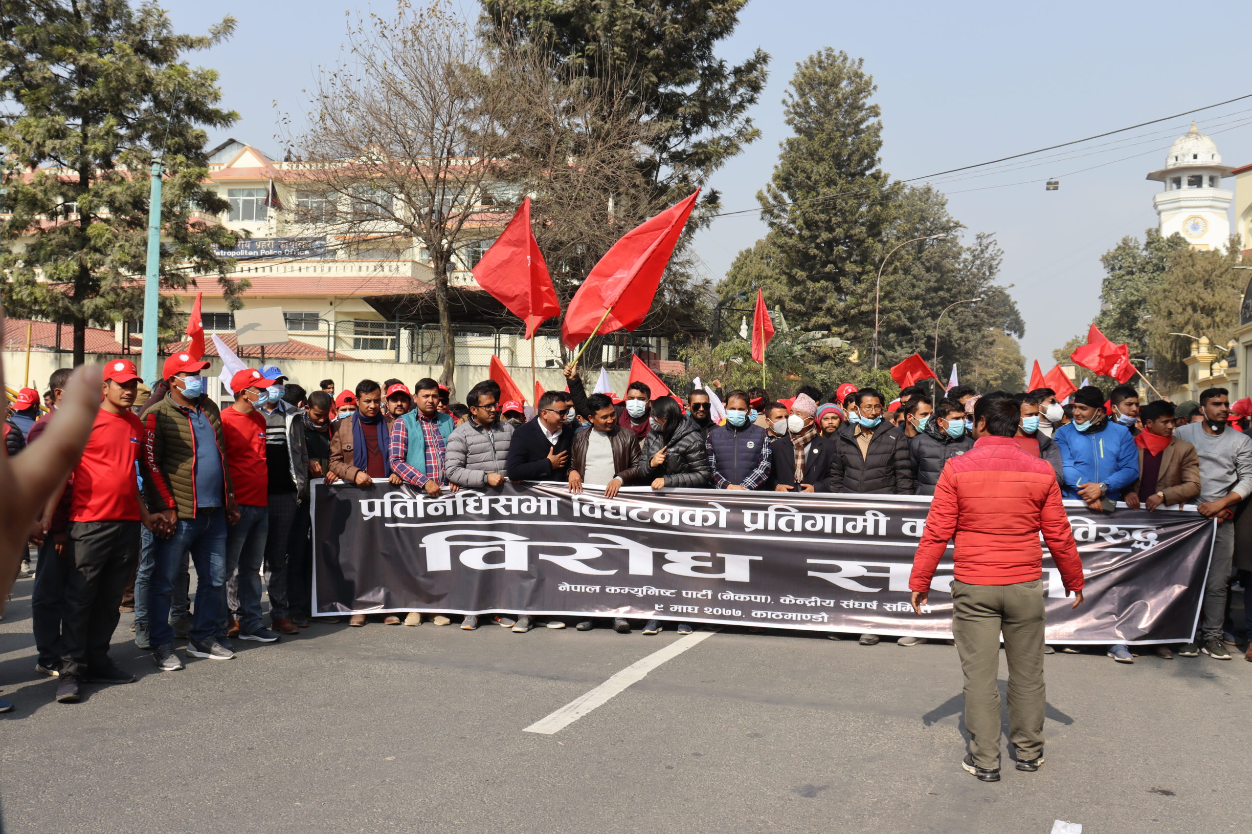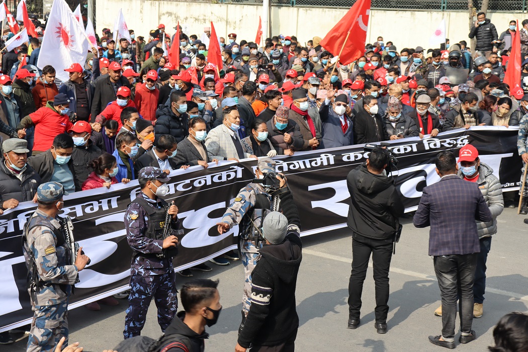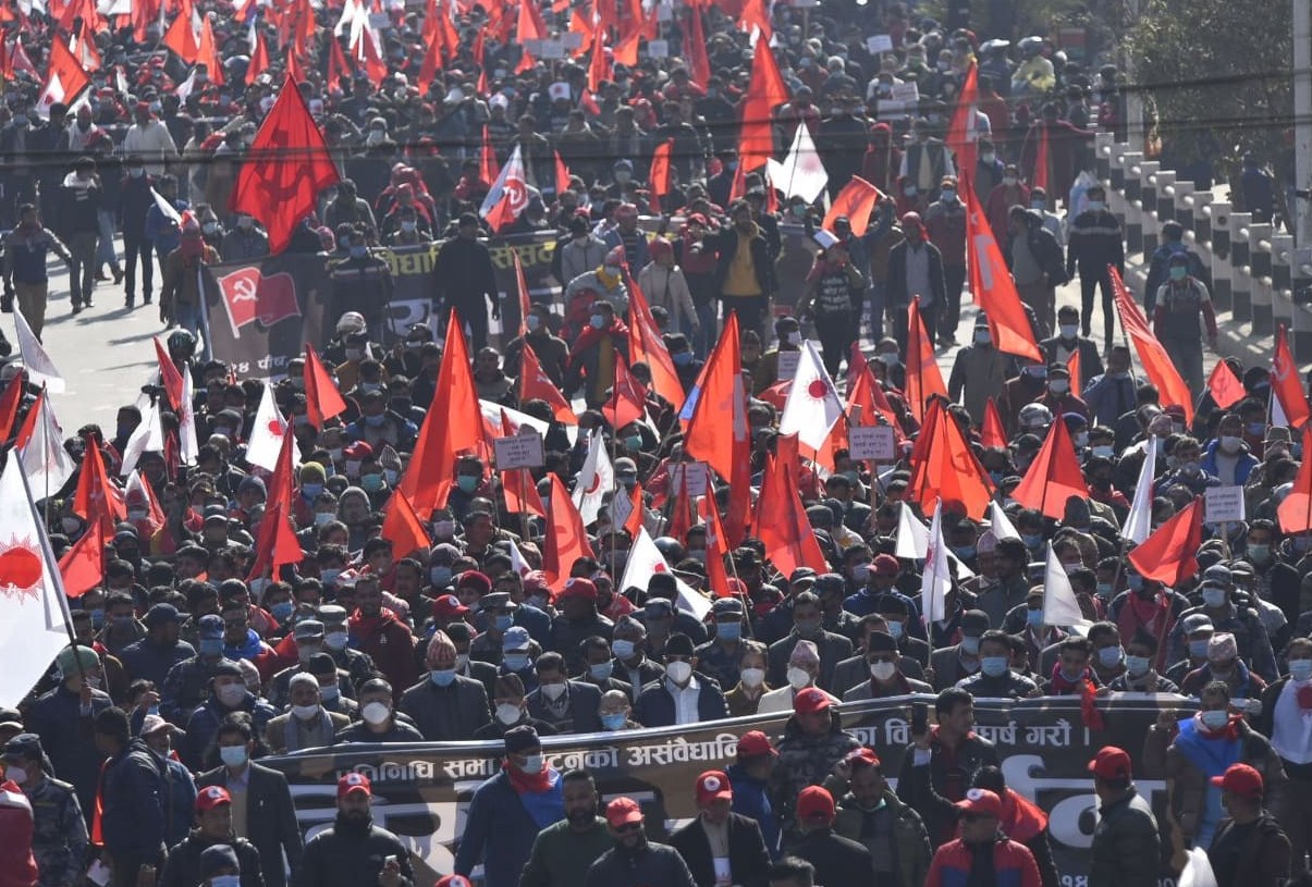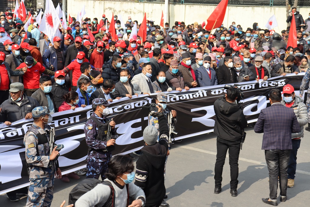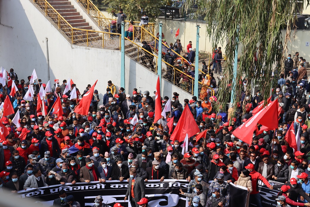माइतीघर, डिल्लीबजार, लैनचौर, त्रिपुरेश्वर, कुपण्डोल, प्रदर्शनीमार्ग, त्रिचन्द्र कलेज, शान्तिबाटिका लगायतका स्थानबाट निस्केको जुलुस एकीकृत हुँदै रत्नपार्क, बागबजार, पुतलीसडक, पद्मोदय मोड हुँदै भृकुटीमण्डपमा पुगिसकेको छ ।